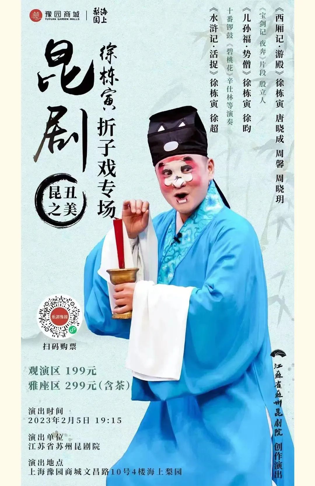 “繁灯夺霁华,戏鼓侵明发”。传统节日是非物质文化遗产的重要组成部分,2023年江苏省苏州昆剧院以庆祝元宵佳节为契机,于2月5日(正月十五)在上海豫园商城海上梨园推出《昆丑之美—徐栋寅昆剧折子戏专场》,弘扬中华优秀传统文化,让文化遗产“活起来”“火起来”。《西厢记·游殿》《儿孙福·势僧》《水浒记·活捉》共3出昆曲丑行极具代表性的折子戏,以及脍炙人口的林冲《夜奔》片段,十番锣鼓《碧桃花》,足以让观众陶醉其间,过足戏瘾!
