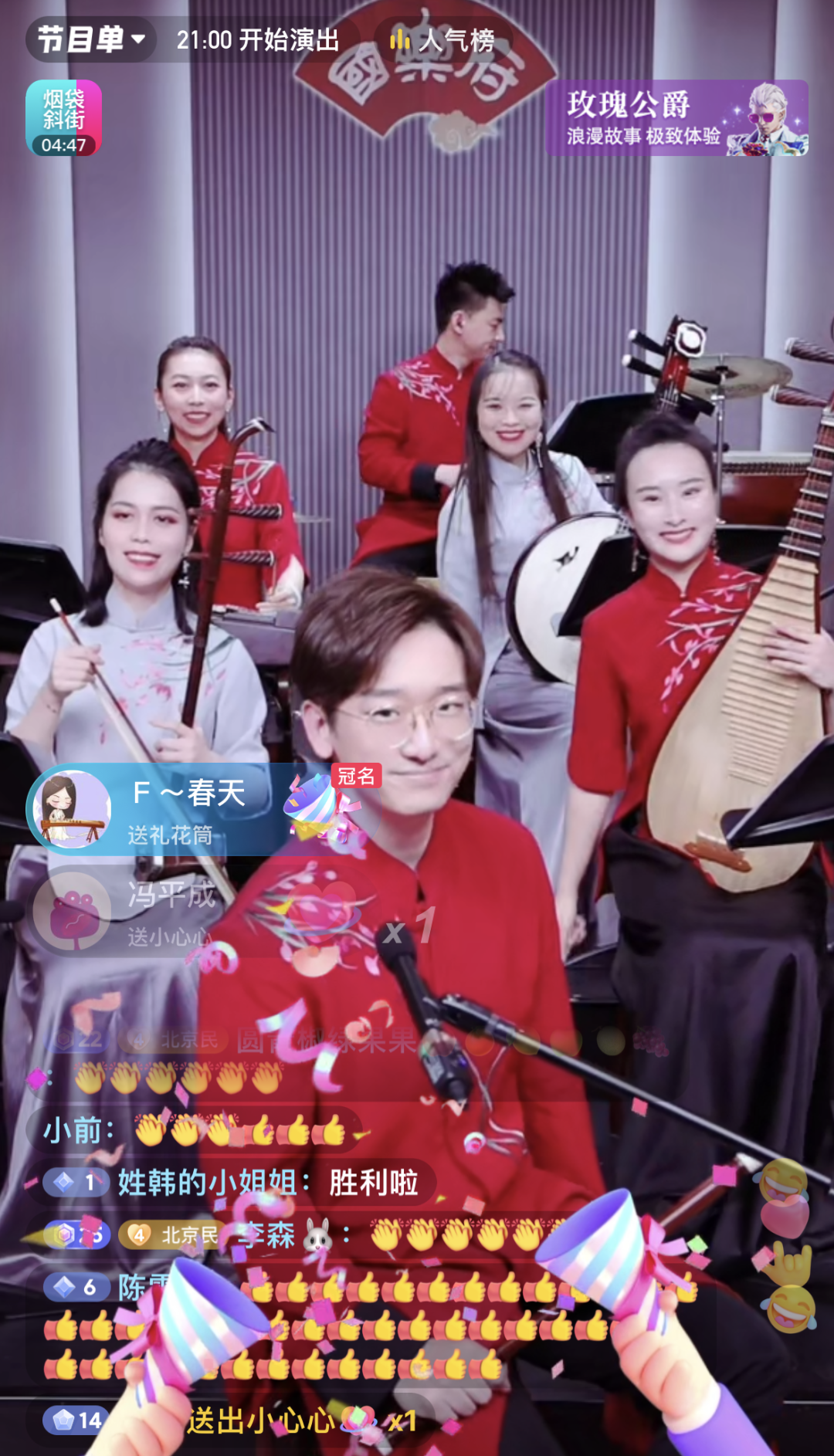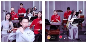 二胡首席崔璨、阮首席李雨涵、扬琴演奏员吴娱、笛箫演奏员蒋锦雯掀起一阵“优雅风”,以专业的表演满足网友的点歌需求。