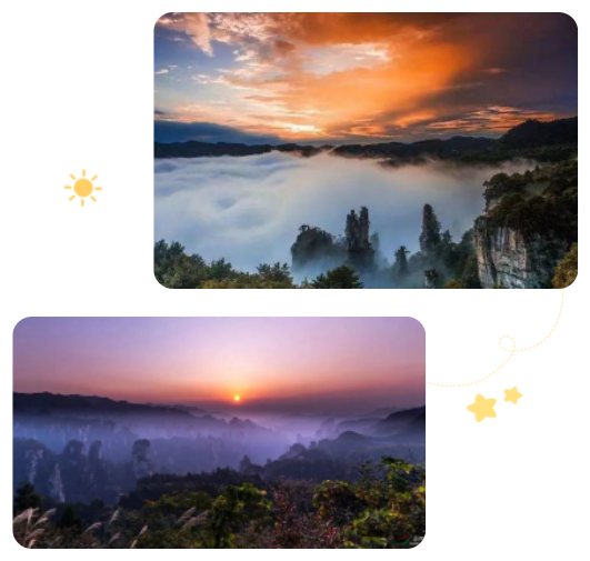 在这里宗教文化,山水文化,书院文化源远流长,是张家界的文化圣地,张家界之魂,吸引着无数游人不远万里来此探寻,放眼云雾深处的奇峰,倾听“天界佛国”的暮鼓晨钟,领略天下第一公路奇观“通天大道”,惊叹东方“天空之路”玻璃栈道,品味千古流传的美丽传说。