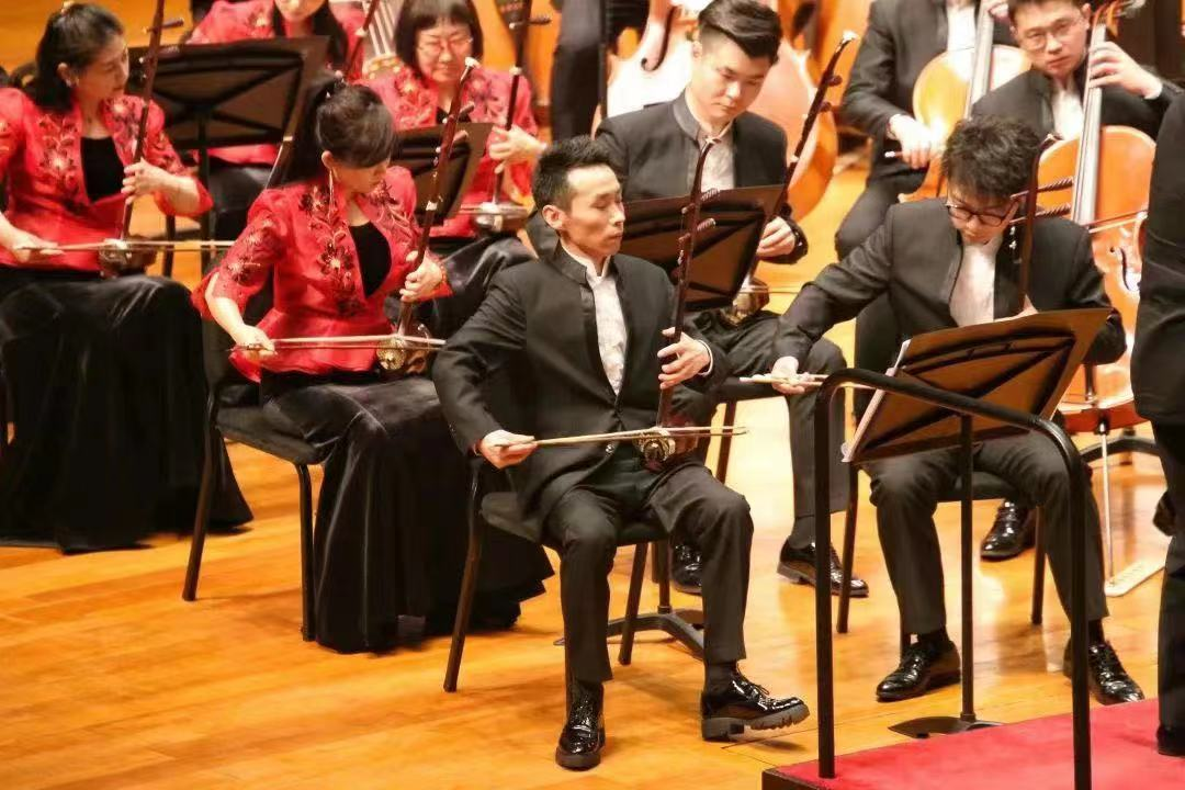 中央民族乐团当天的演奏无愧“国家队”名号。全场演奏尽显国乐煌煌,端庄大气又不失“低眉细语”“百转千回”的细腻之感。开场曲《写意山水》(李尚谦作)引子部分,管乐声部、弹拨乐声部和弓弦声部出色的平衡听感,把山水画面远近高低的层次细致勾勒,乐团对快慢衔接与复合节奏的把控也是信手拈来。此曲中有大量笛子的困难片段,整个笛子声部都在技巧完成的基础上做到了艺术化处理,使山水更加写意。唢呐声部也在控制力和穿透力之间做到了完美平衡。