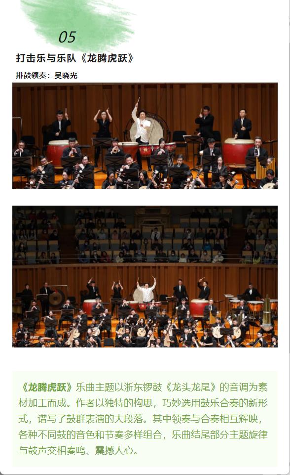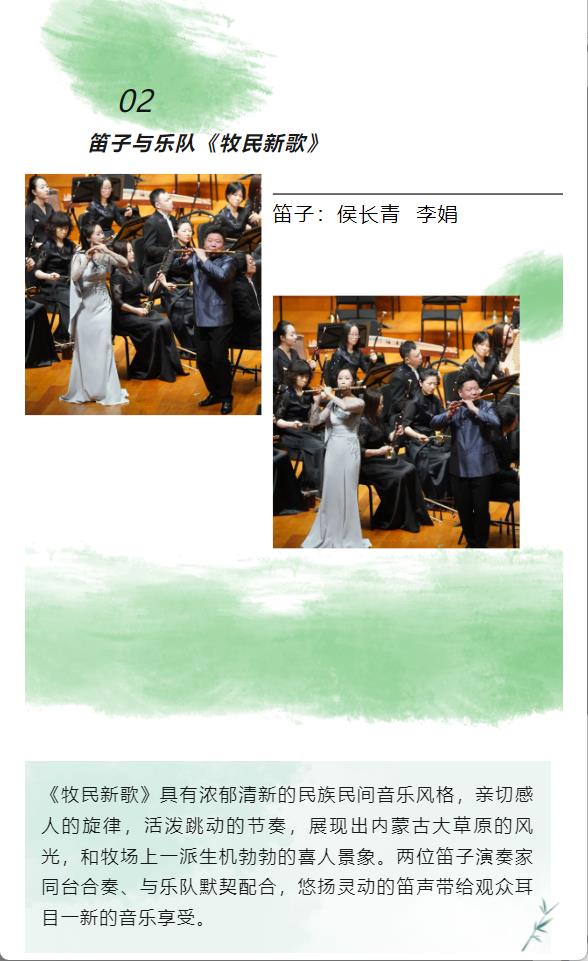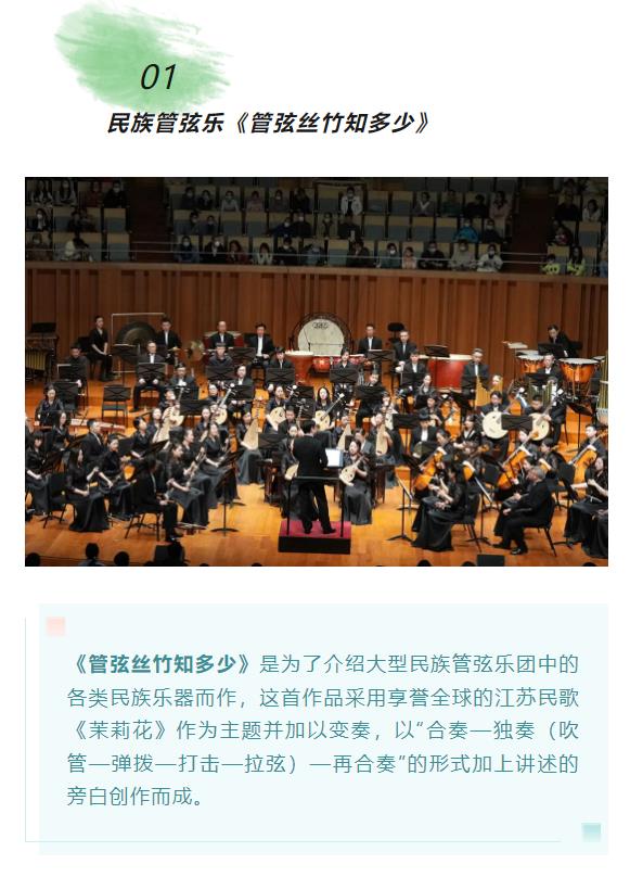 本场音乐会以“演讲结合”的形式,深入浅出地普及民族音乐知识,讲解经典曲目背后的故事,并结合大众喜闻乐见的民乐名曲,向广大观众生动详实地介绍民族管弦乐队拉弦、弹拨、吹管、打击乐声部的乐器家族成员,各自的声音特点、演奏技巧和历史演变。