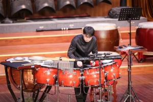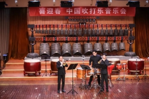 音乐会由2019级民打专业学生徐国伟演奏的打击乐独奏《鼓上铜乐》拉开序幕。此曲是王以东所创,是一首以中国传统打击乐器和西洋打击乐器相结合的组合打击乐独奏曲目。该作品将一组“铜响器”置于鼓面上,节奏、音色和演奏技法求新,以节奏神韵和音色变化求全曲之丰富,既有中国鼓传统的演奏及音乐节奏风格,更通过与外来音乐节奏的融和,使其具有新的音乐理念。