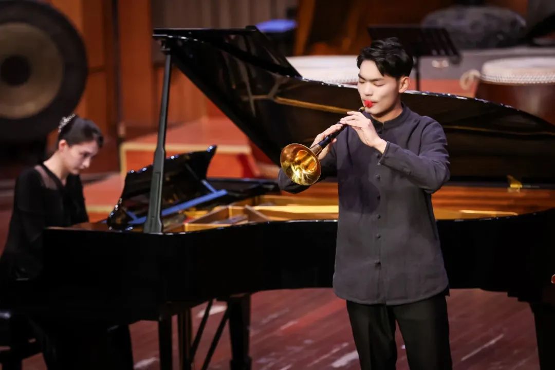 双唢呐与打击乐《泥老板》,由2020级唢呐专业杨玺臻、杨红濠和2020级民打专业张石磊演奏。这是一首双唢呐与板鼓的三重奏作品,由作曲家伍敬彬创作,原为双板胡与板鼓的重奏作品。极具传统意蕴的板鼓声起,两支吸呐一左一右,在你紫我简,我紫你简中,用中国音乐语言表达了既统一又对立的哲学思想。