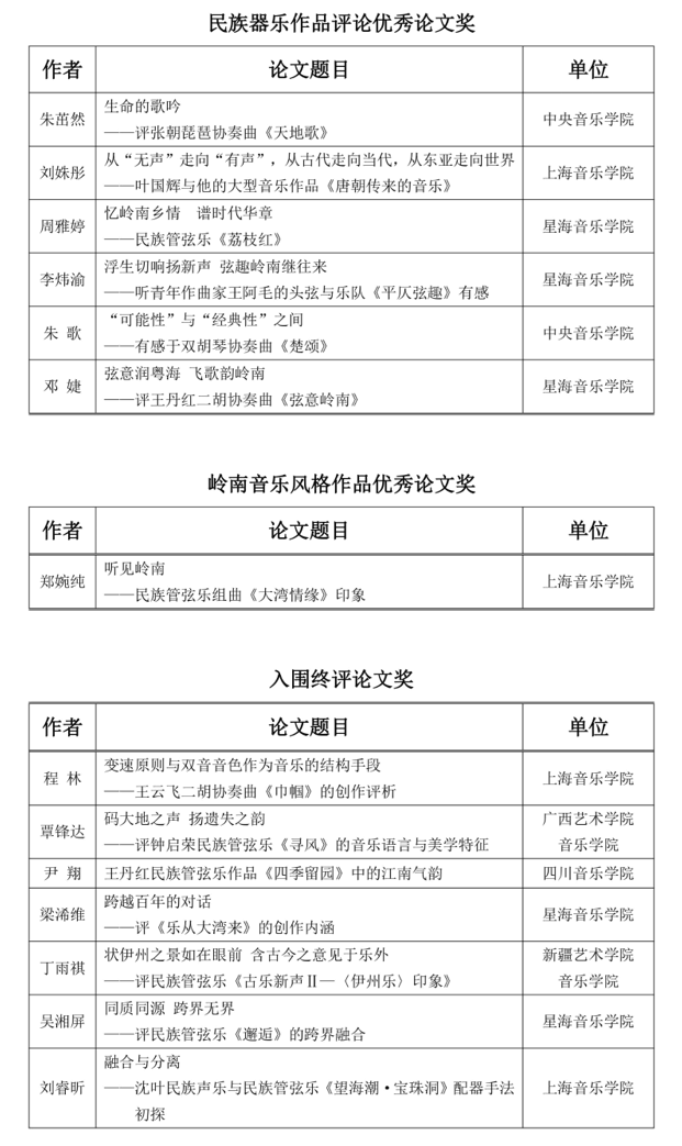 本次终评活动中共评选出“优秀论文奖“6篇、“岭南音乐风格作品优秀论文奖”1篇、“入围终评论文奖”7篇。现将获奖名单公布如下: