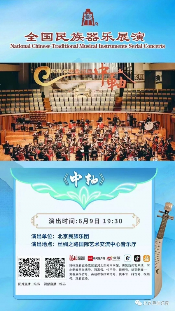北京民族乐团作为本次展演遴选出的10支优秀民族乐团之一,于6月9日晚在丝绸之路国际艺术交流中心音乐厅上演原创民族管弦乐组曲《中轴》,作品由中国音乐家协会主席、著名作曲家叶小纲担任音乐总监并牵头创作,由邹航、杨一博、郑阳、赵曦、李劭晟、刘力、吴延7位活跃在一线的中青年作曲家联合组成作曲团队。音乐会由本团常任指挥张鸣执棒。