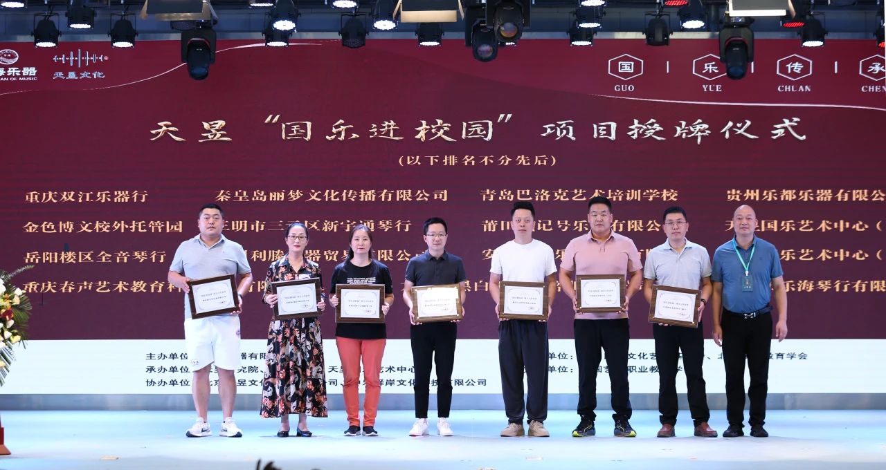在国乐文化艺术发展的过程中,始终都有着很多志同道合的合作伙伴,在全国已经有着国乐普及的学校几百所,最近又增加了一部分的合作伙伴,我们秉持共创、共享、共赢的原则,为他们颁发项目授权牌:分别是重庆双江乐器行、秦皇岛丽梦文化传播有限公司、青岛巴洛克艺术培训学校、岳阳楼区全音琴行、金色博文校外托管园、重庆春声艺术教育科技股份有限公司、莆田城记号乐器有限公司、天昱国乐艺术中心(肃宁)、天昱国乐艺术中心(北京)、广州利滕乐器贸易有限公司、安徽徽府乐坊文化有限公司、贵州乐都乐器有限公司、三明市三元区新宇通琴行、龙港市黑白键艺术培训有限公司、合肥市乐海琴行有限公司。
