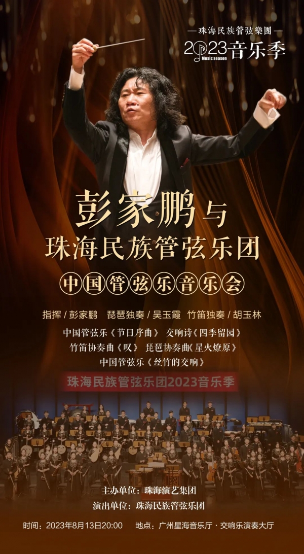 2023年8月13日晚,由中共珠海市委宣传部指导、珠海演艺集团主办、珠海民族管弦乐团演出的“珠海民族管弦乐团2023音乐季”《彭家鹏与珠海民族管弦乐团》民族管弦乐音乐会在广东星海音乐厅圆满落下帷幕。