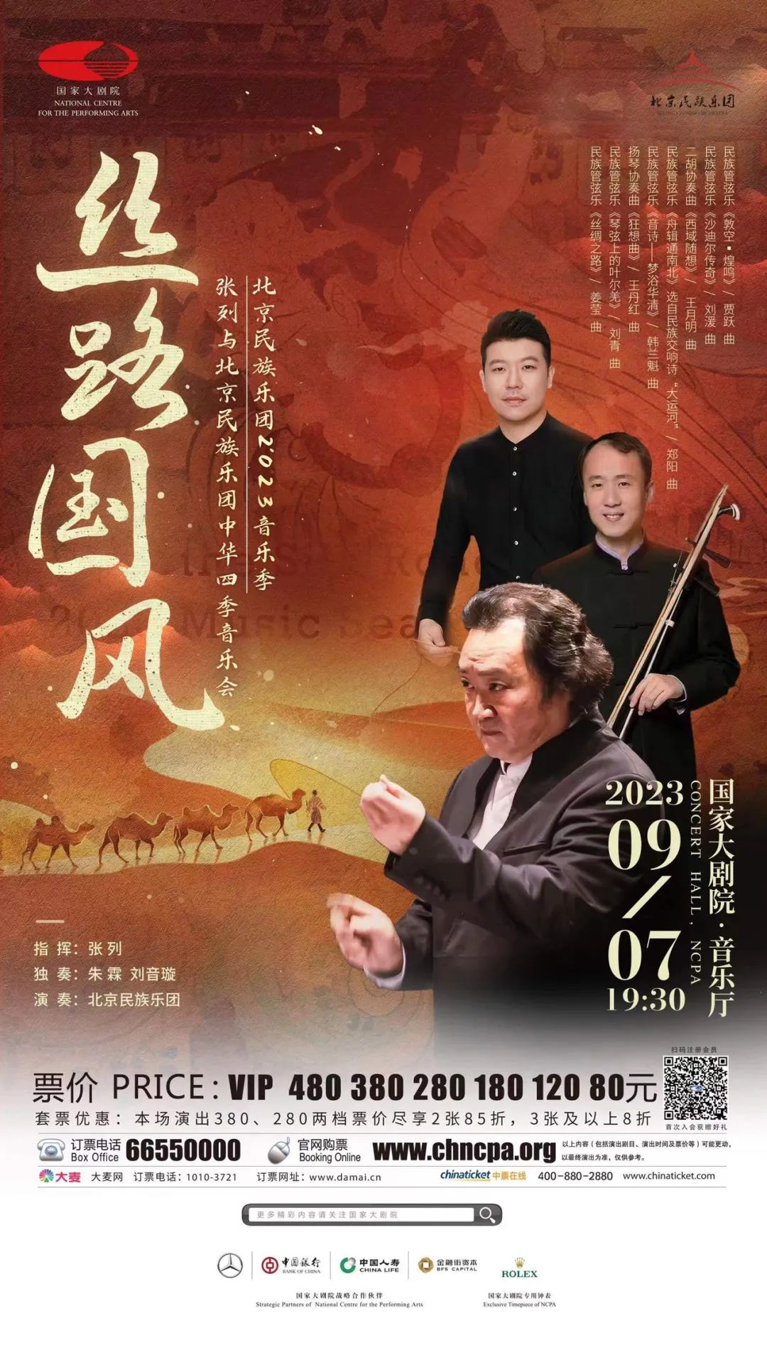 2023年9月7日19:30分,北京民族乐团2023音乐季---《丝路国风》张列与北京民族乐团中华四季音乐会将在国家大剧院音乐厅亮相。