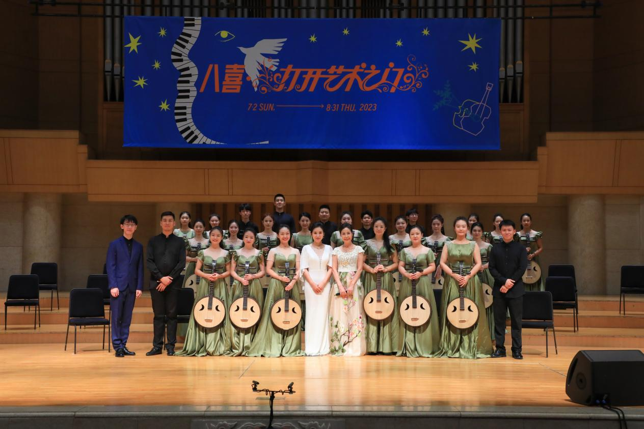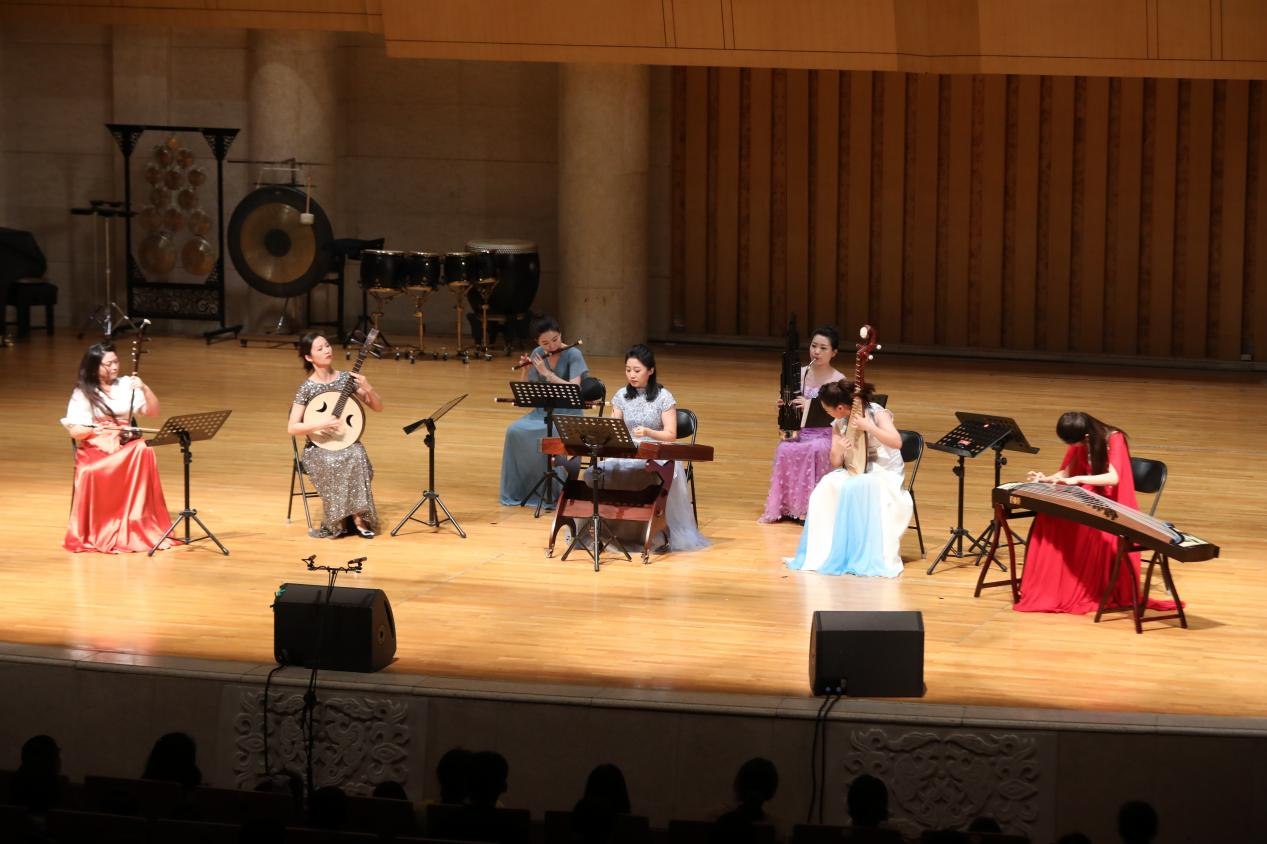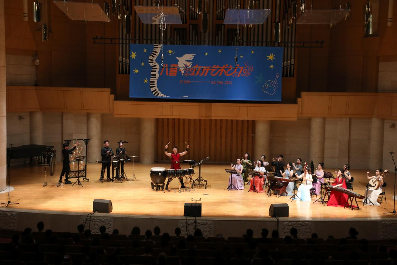 二、央音品质。“国乐马拉松音乐会”的各个环节都呈现了高品质的专业水准与专业精神,从演出形式的安排到演出曲目的选择,每一个细节都经过了民乐系师生的多次考量与打磨。为了对应“打开艺术之门”暑期系列音乐会的主题,所有音乐会选曲都兼顾了作品类型的广泛性与演出形式的专业性。以本届“国乐马拉松”的综合性音乐盛典《四海之音·国乐嘉年华音乐会》为例,中央音乐学院民乐系青年国乐团在90分钟的时间内呈现了9首不同类型的乐曲:在主奏乐器上,涵盖了笛子、中阮、古琴、古筝、二胡、打击乐的重点展示;在乐队编制上,包括独奏、二重奏、三重奏、五重奏、合奏、民族室内乐、打击乐与乐队等不同形式;在曲目选择上,有传统的千年古曲《流水》,有耳熟能详的改编曲《山丹丹开花红艳艳》《梁山伯与祝英台》《映山红》,也有近两年的新创作《敦煌新语》《锦上云华》,有传统音乐《行街》,也有专业作曲家创作的《秦川情》《孤芳自赏》;在音乐风格上,有丝弦泠泠的低吟浅唱,也有锣鼓喧嚣的慷慨激昂,有委婉缠绵的江南韵味,也有沧桑神秘的大漠豪情。整场演出虽然曲目不多,但从各个角度、多个层面上都尽可能实现了音乐作品呈现的代表性与广泛性。