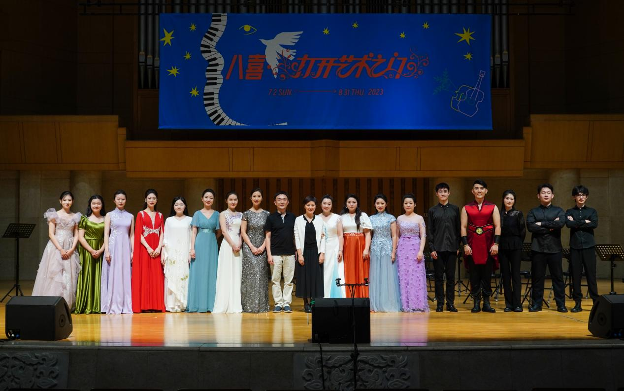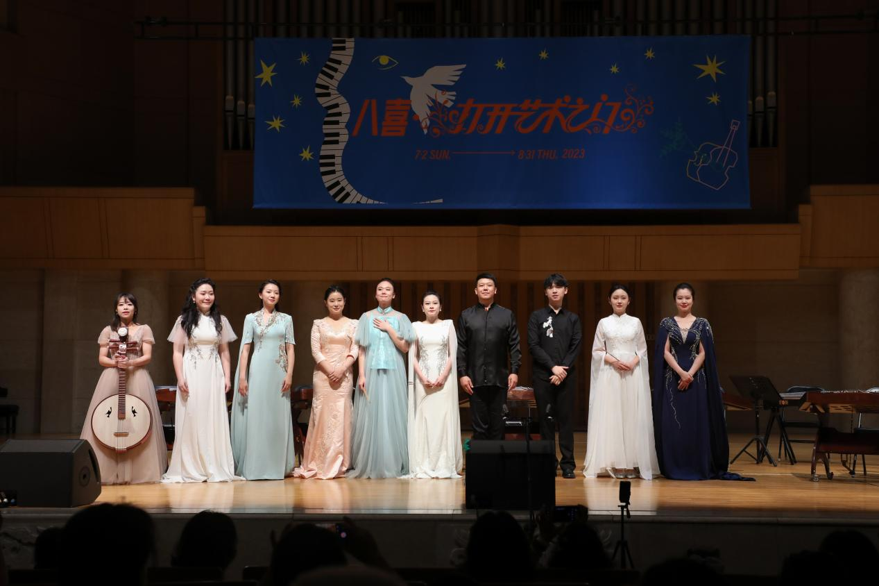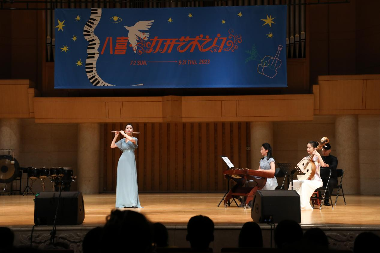 二、央音品质。“国乐马拉松音乐会”的各个环节都呈现了高品质的专业水准与专业精神,从演出形式的安排到演出曲目的选择,每一个细节都经过了民乐系师生的多次考量与打磨。为了对应“打开艺术之门”暑期系列音乐会的主题,所有音乐会选曲都兼顾了作品类型的广泛性与演出形式的专业性。以本届“国乐马拉松”的综合性音乐盛典《四海之音·国乐嘉年华音乐会》为例,中央音乐学院民乐系青年国乐团在90分钟的时间内呈现了9首不同类型的乐曲:在主奏乐器上,涵盖了笛子、中阮、古琴、古筝、二胡、打击乐的重点展示;在乐队编制上,包括独奏、二重奏、三重奏、五重奏、合奏、民族室内乐、打击乐与乐队等不同形式;在曲目选择上,有传统的千年古曲《流水》,有耳熟能详的改编曲《山丹丹开花红艳艳》《梁山伯与祝英台》《映山红》,也有近两年的新创作《敦煌新语》《锦上云华》,有传统音乐《行街》,也有专业作曲家创作的《秦川情》《孤芳自赏》;在音乐风格上,有丝弦泠泠的低吟浅唱,也有锣鼓喧嚣的慷慨激昂,有委婉缠绵的江南韵味,也有沧桑神秘的大漠豪情。整场演出虽然曲目不多,但从各个角度、多个层面上都尽可能实现了音乐作品呈现的代表性与广泛性。