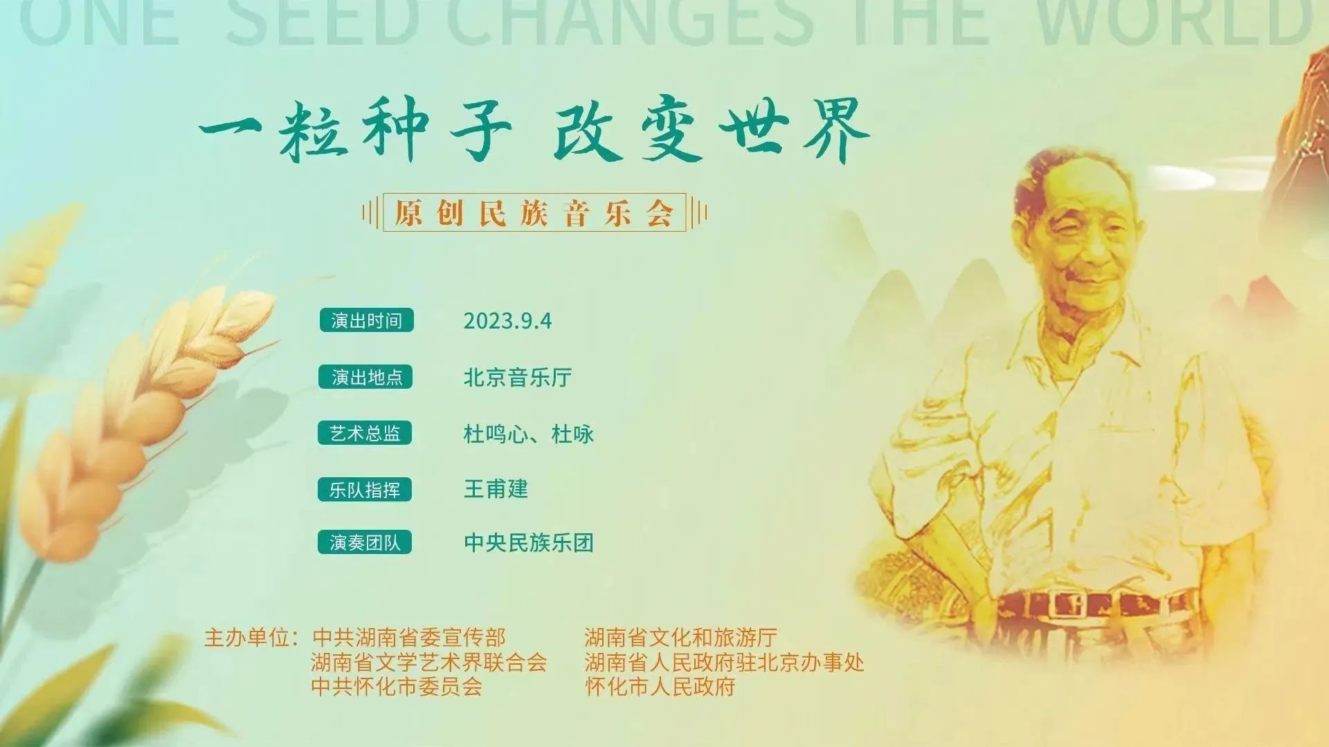 “一粒种子 改变世界”原创民族音乐会由湖南省委宣传部、湖南省文化和旅游厅、湖南省文联、湖南省人民政府驻北京办事处与中共怀化市委、市人民政府共同主办,将于9月4日在北京音乐厅首演,于9月13日、9月15日分别在长沙、怀化进行巡演。