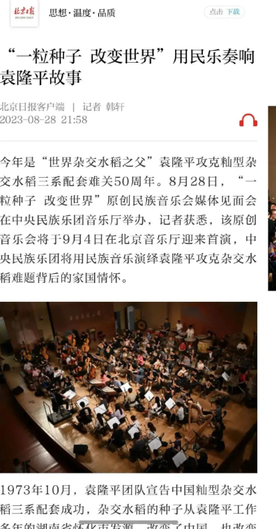 赵聪团长谈到:“用中国乐器奏响中国声音,用民族音乐诠释袁隆平精神。我们希望通过这场音乐会,致敬袁老的杰出贡献,将袁老的精神传播到祖国大地,并传向全世界。”