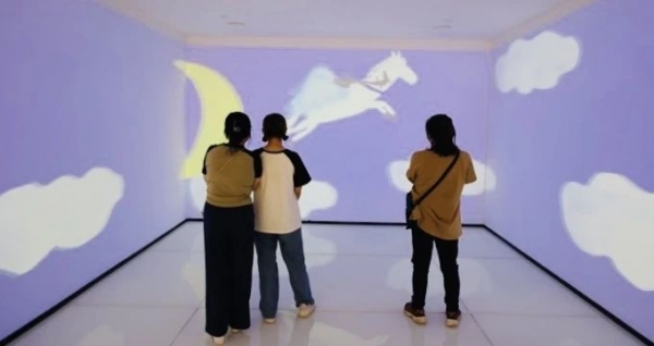 “涤尘”以三面投影展现原创《国乐中的十二生肖》系列数字化视听内容产品,更好地为少儿及亲子观众群体带去独一无二的沉浸式体验。“幽兰墙”展示了古琴谱《幽兰》最古老的版本片段,投射在休闲步道上的“宫商角徵羽”,更增加了中国传统音乐的意趣。