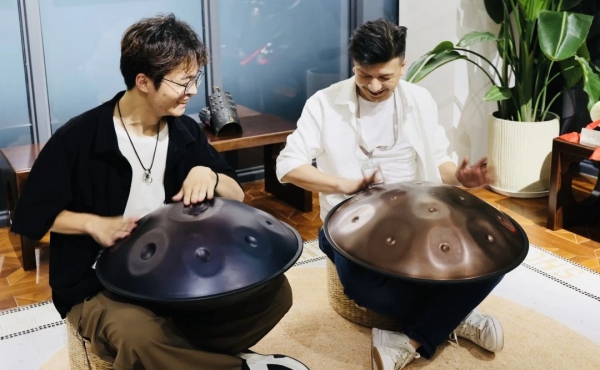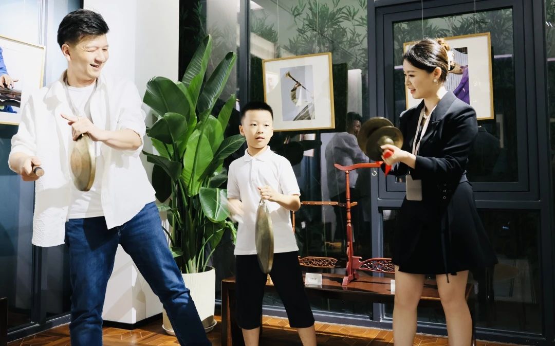 “翠羽”既可作为饮茶听音的休憩一角,也是乐团“国乐中的十二生肖”等系列文创产品的售卖空间。“响泉”以民乐打击乐器的展示,打击乐演奏家杨阳和胡嘉倩和参观者们现场演奏互动。“陶然”以户外舞台的形式,打造悠然自在的民乐表演氛围,会客国乐,不亦乐乎。