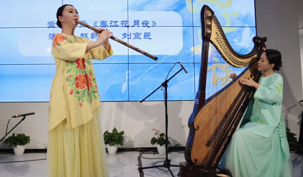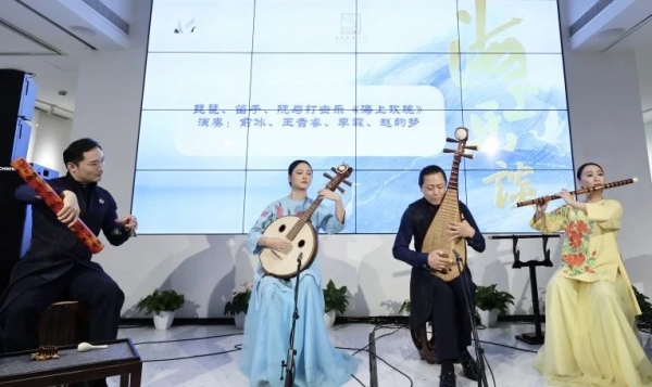 上海民族乐团琵琶声部首席俞冰、打击乐声部首席王音睿、阮演奏家李霖、笛箫演奏家赵韵梦、箜篌演奏家刘宣邑、特邀古琴演奏家龚幽兰等带来了《海上玫瑰》《春江花月夜》《幽兰》(节选)等精彩演奏,在当代又典雅的艺术空间,观众近距离感受国乐律动、乐韵盎然,纷纷拿起手机记录美妙时刻。