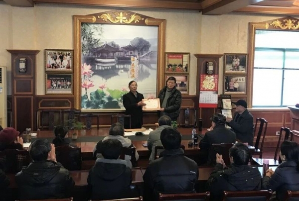 杨总给东艾传承基地主任丁学泉(右一)颁发聘任书