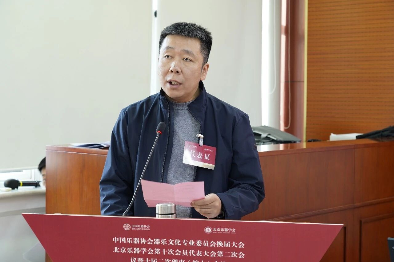 会议严格遵循《中国乐器协会章程》及相关规定,审议并全票通过了舒云副会长代表理事会所作的《中国乐器协会器乐文化专业委员会理事会工作报告》。报告系统回顾了过去五年专委会在学术研究、文化推广、人才培育、标准制定等方面的显著成效,获得与会代表高度认可。随后,中国乐器协会副秘书长金岩宣读了《关于器乐文化专业委员会新一届领导班子推荐人选的批复》,通过举手表决方式选举产生新一届领导机构:孙瑞勇当选主任,金岩当选常务副主任兼秘书长,刘正辉、张玉榛、杨守成、林玲、赵寒阳当选副主任,同时选举产生55 名常务理事、137 名理事,并聘请曾泽民、杨青等 5 人为顾问,毕可炜为名誉主任。