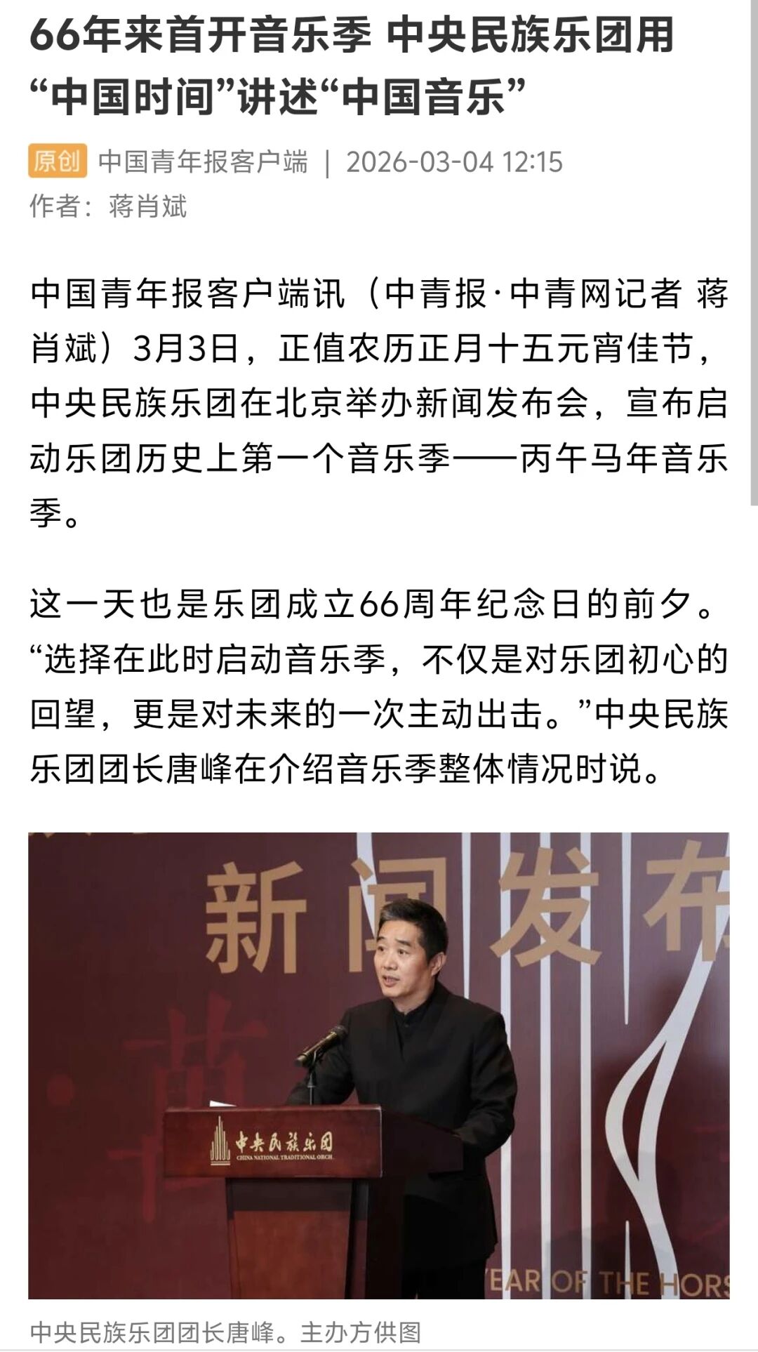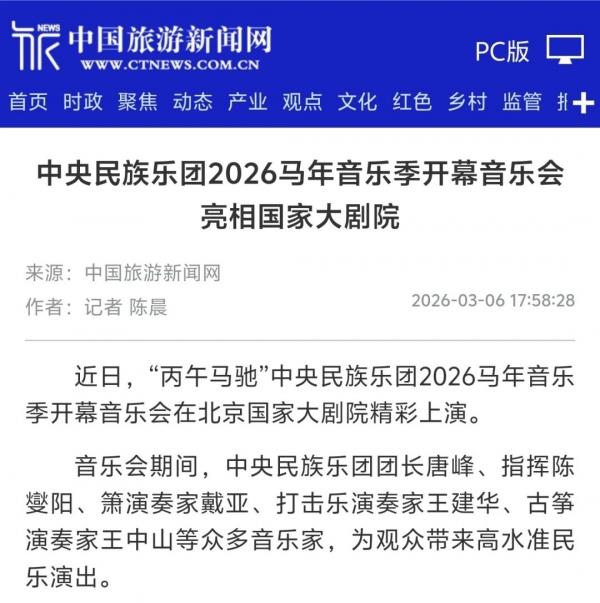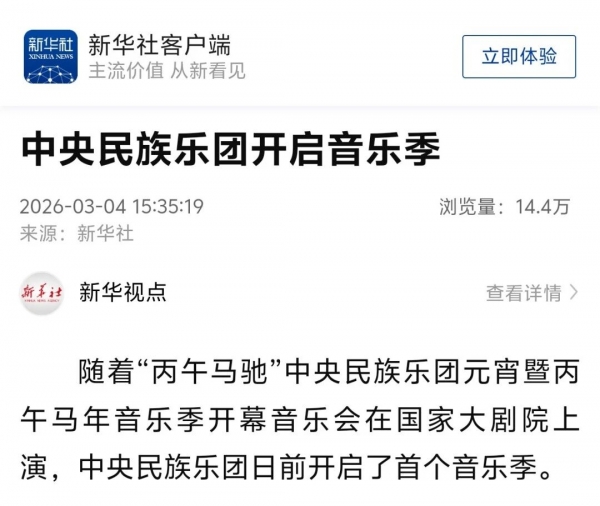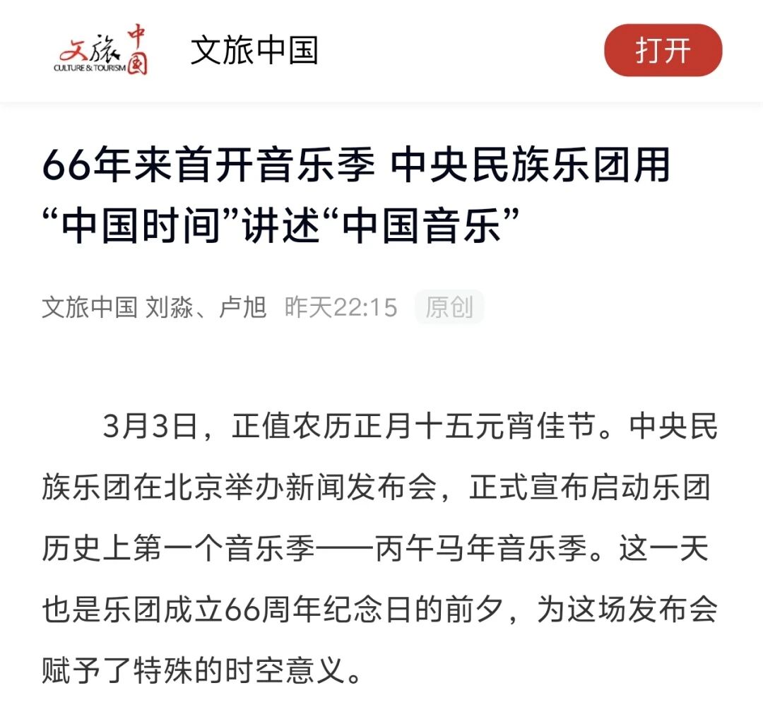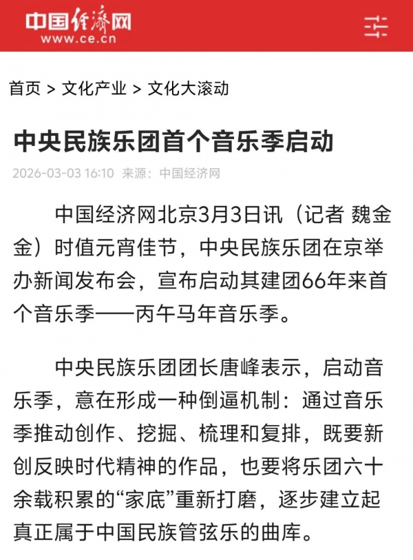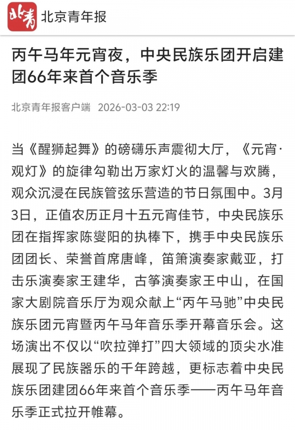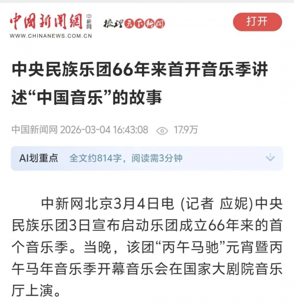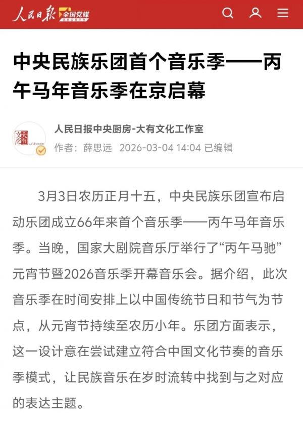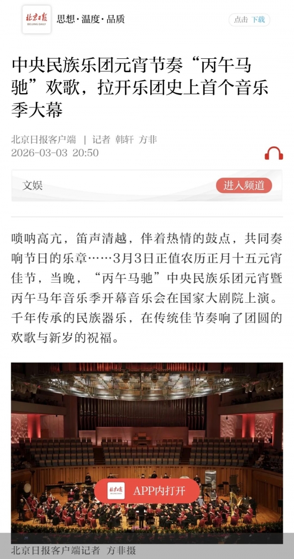 3月3日正值农历正月十五元宵佳节,中央民族乐团在北京举办新闻发布会,正式宣布启动乐团历史上第一个音乐季——丙午马年音乐季。当晚,“丙午马驰”中央民族乐团元宵暨丙午马年音乐季开幕音乐会在国家大剧院精彩上演。这是中央民族乐团成立66年首次启动音乐季。在66年的时光沉淀中,一大批具有民族特色的民族管弦乐作品经过整理挖掘、反复打磨,以全新的姿态走进大众视野,用民族的音乐语言讲述中国的时代故事。此次活动获得人民日报、光明日报、中央广播电视总台、新华社、中新社、中国文化报、音乐周报、中国日报、中国青年报、环球时报、中国艺术报、北京卫视、北京日报、北京青年报等诸多媒体的集中关注报道。