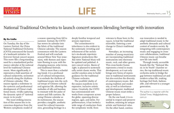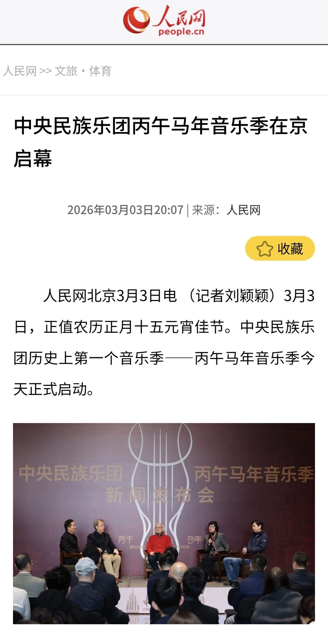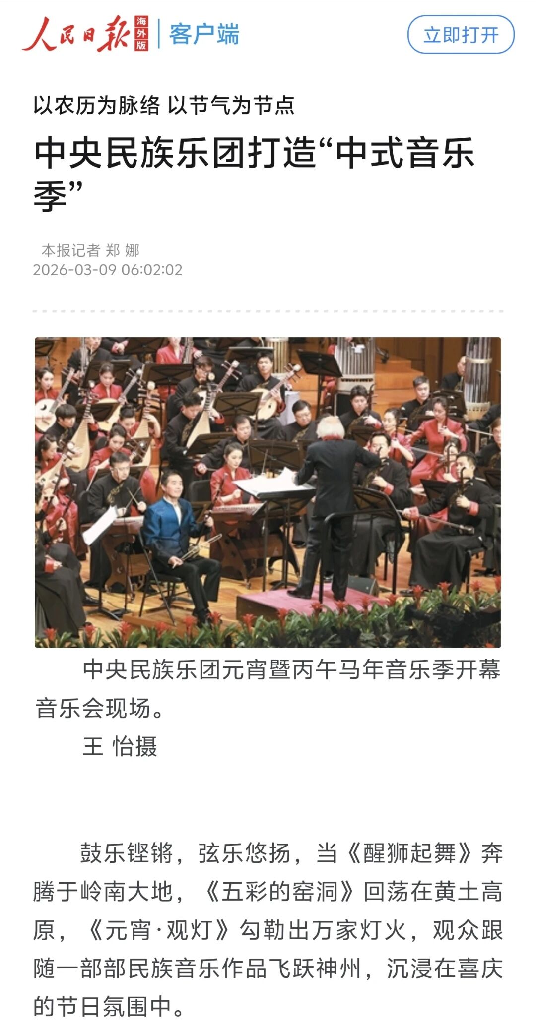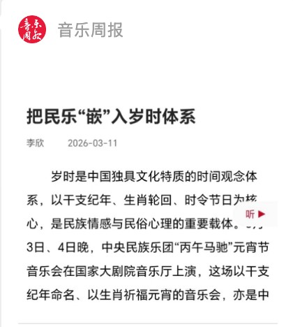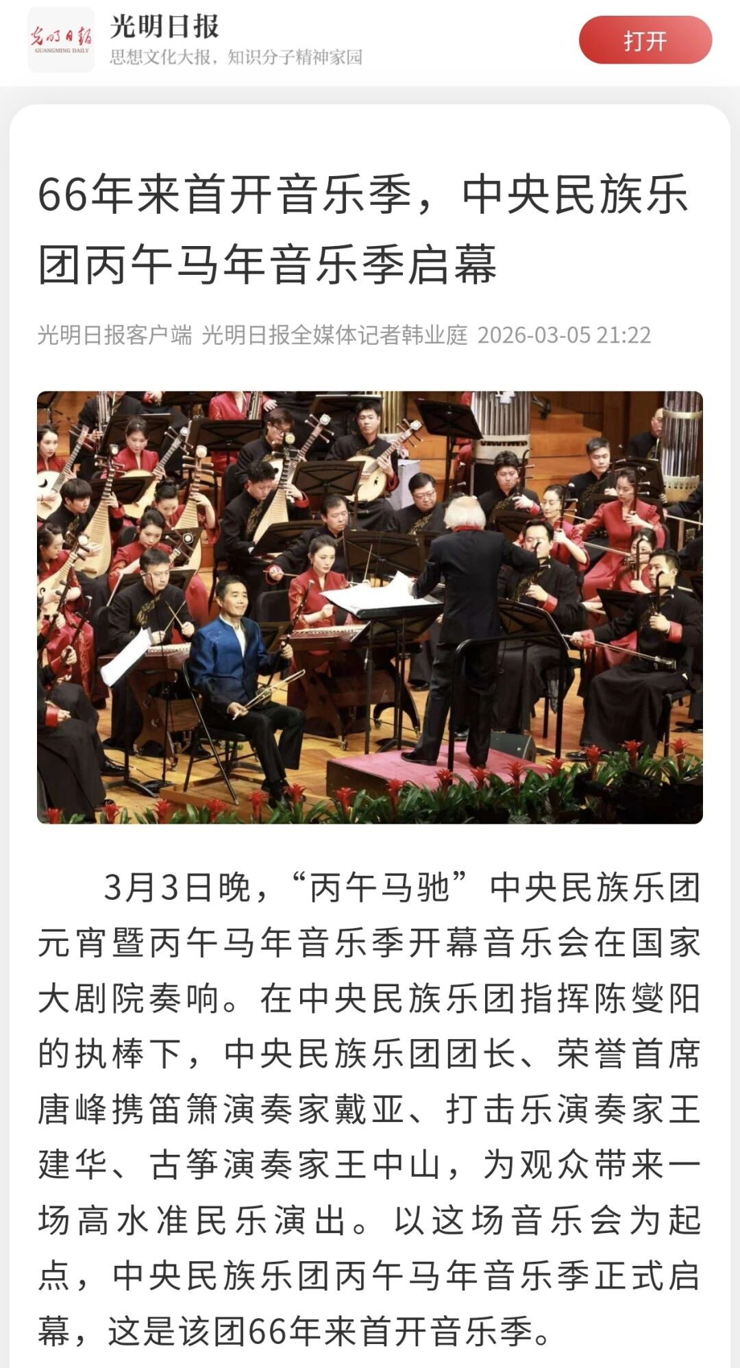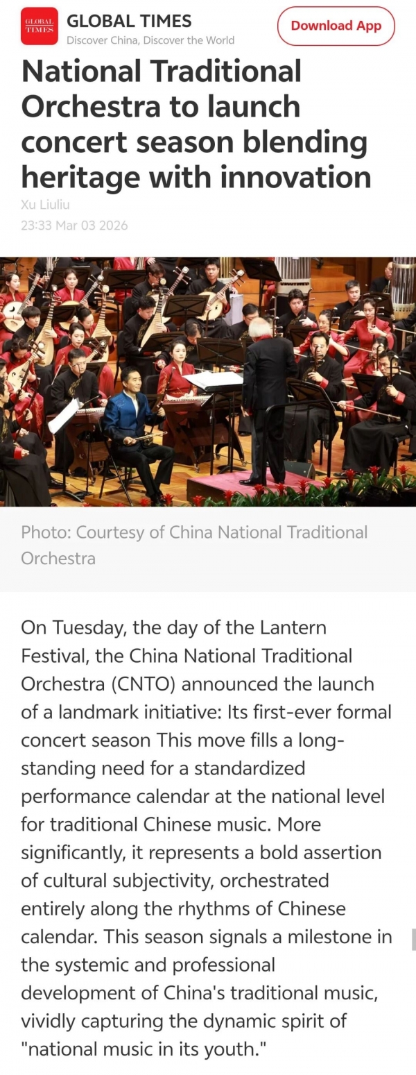 3月3日正值农历正月十五元宵佳节,中央民族乐团在北京举办新闻发布会,正式宣布启动乐团历史上第一个音乐季——丙午马年音乐季。当晚,“丙午马驰”中央民族乐团元宵暨丙午马年音乐季开幕音乐会在国家大剧院精彩上演。这是中央民族乐团成立66年首次启动音乐季。在66年的时光沉淀中,一大批具有民族特色的民族管弦乐作品经过整理挖掘、反复打磨,以全新的姿态走进大众视野,用民族的音乐语言讲述中国的时代故事。此次活动获得人民日报、光明日报、中央广播电视总台、新华社、中新社、中国文化报、音乐周报、中国日报、中国青年报、环球时报、中国艺术报、北京卫视、北京日报、北京青年报等诸多媒体的集中关注报道。