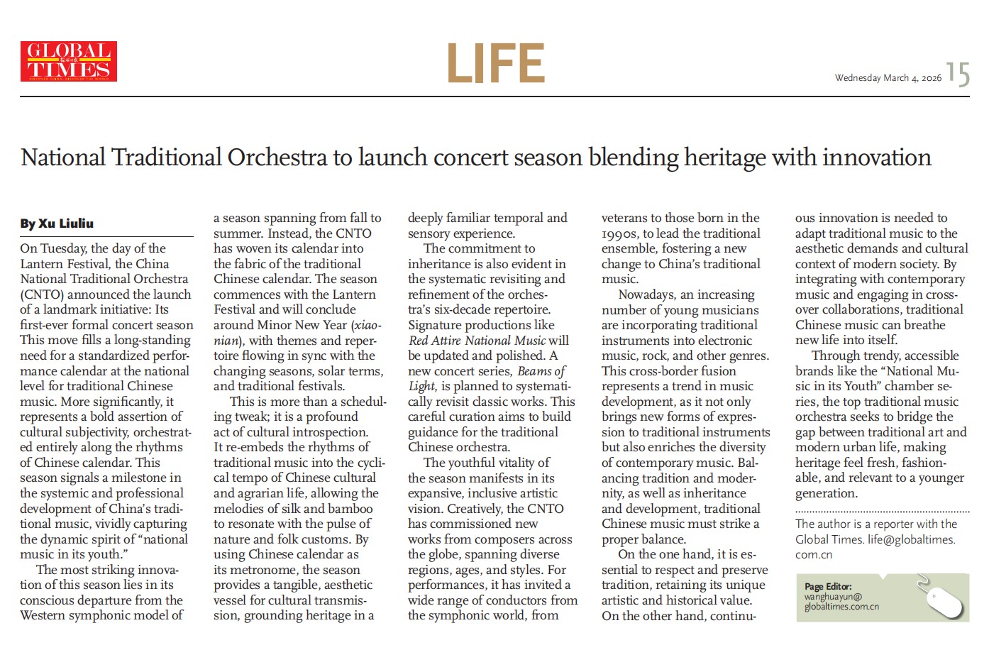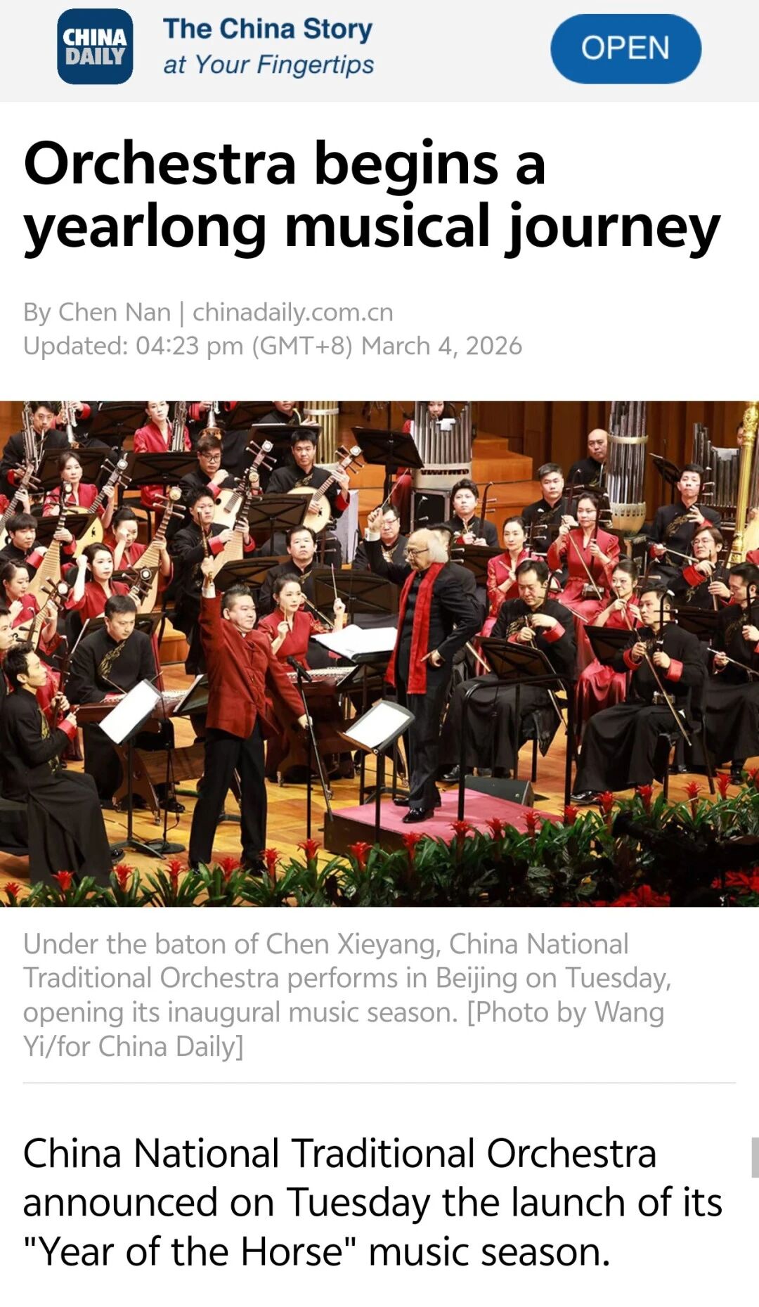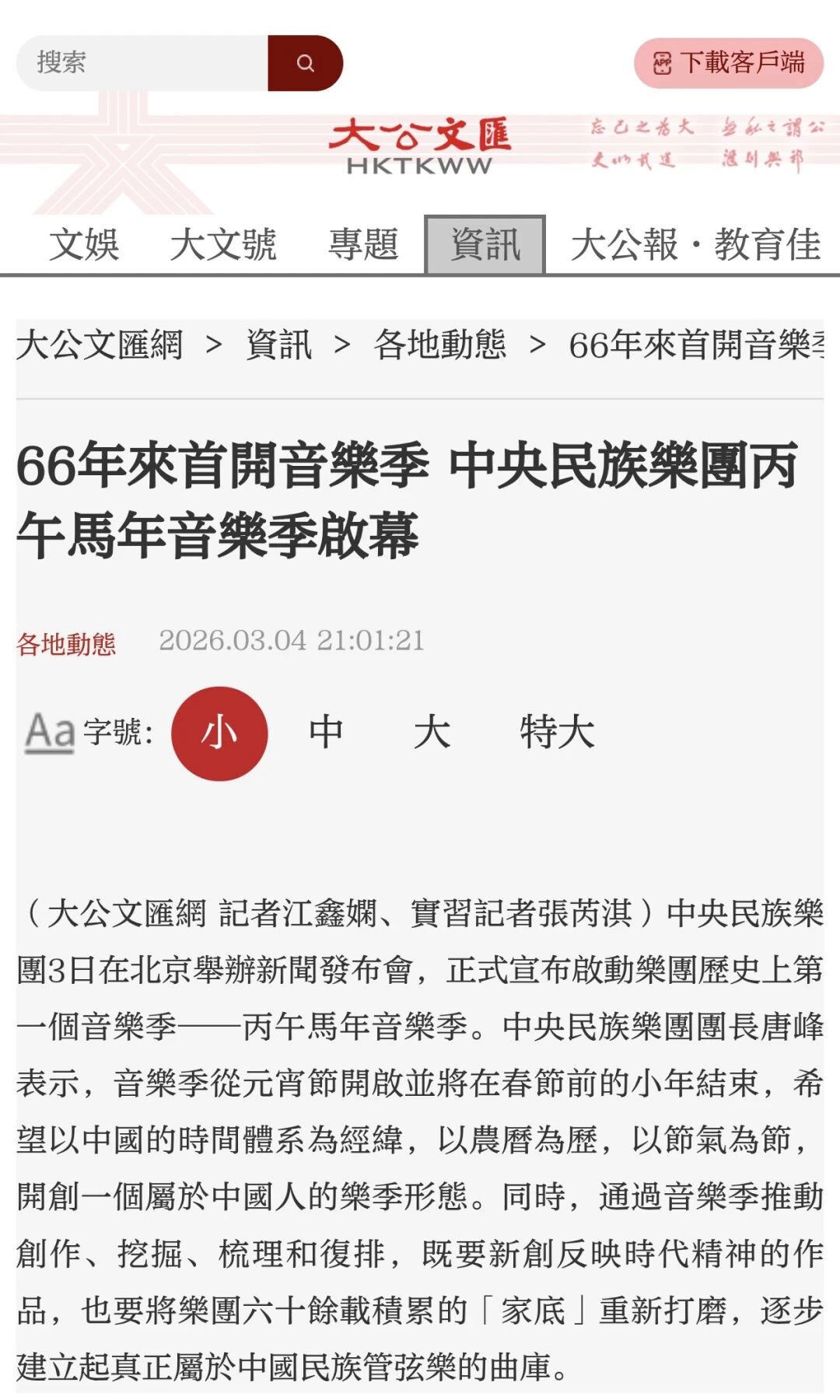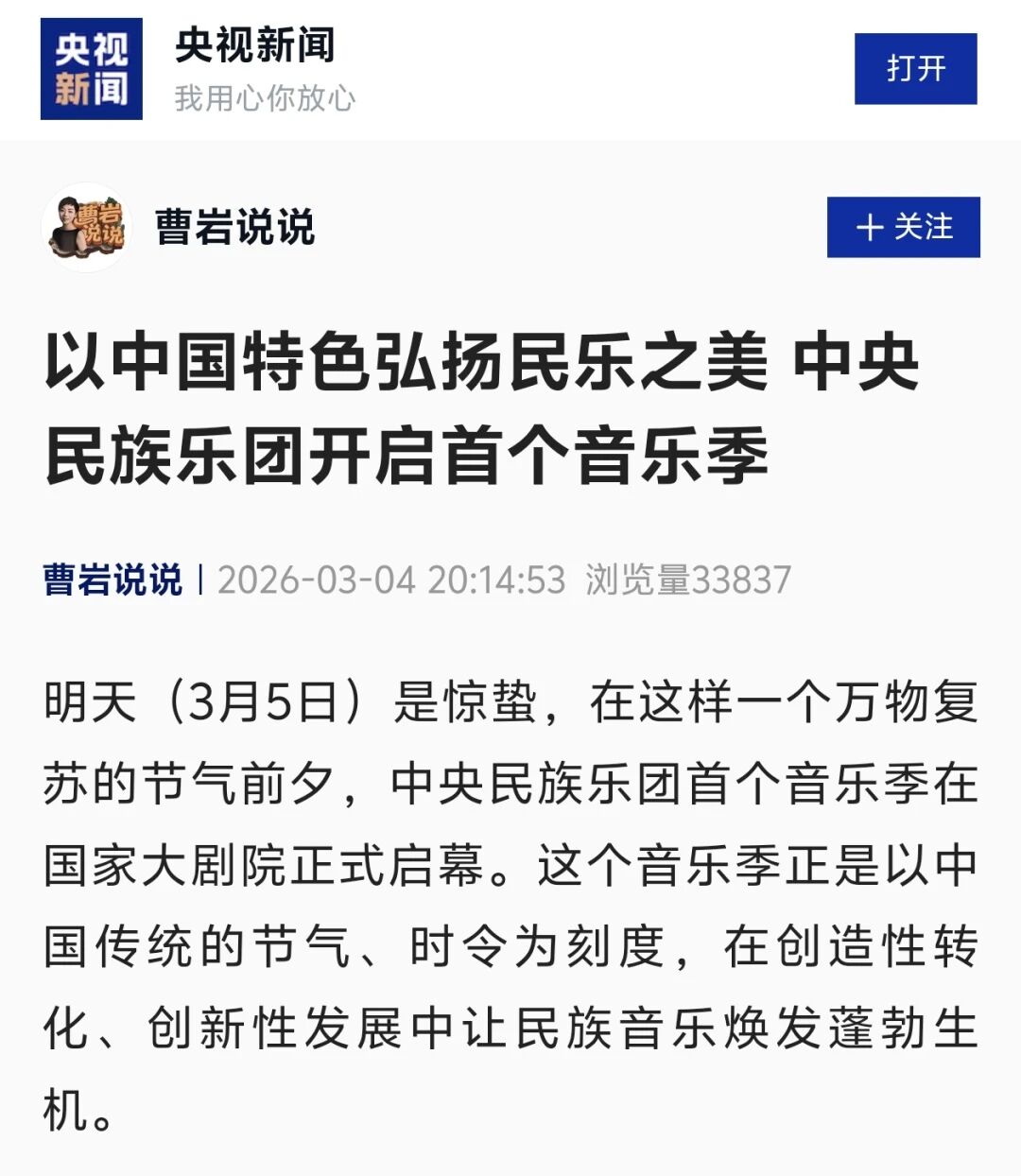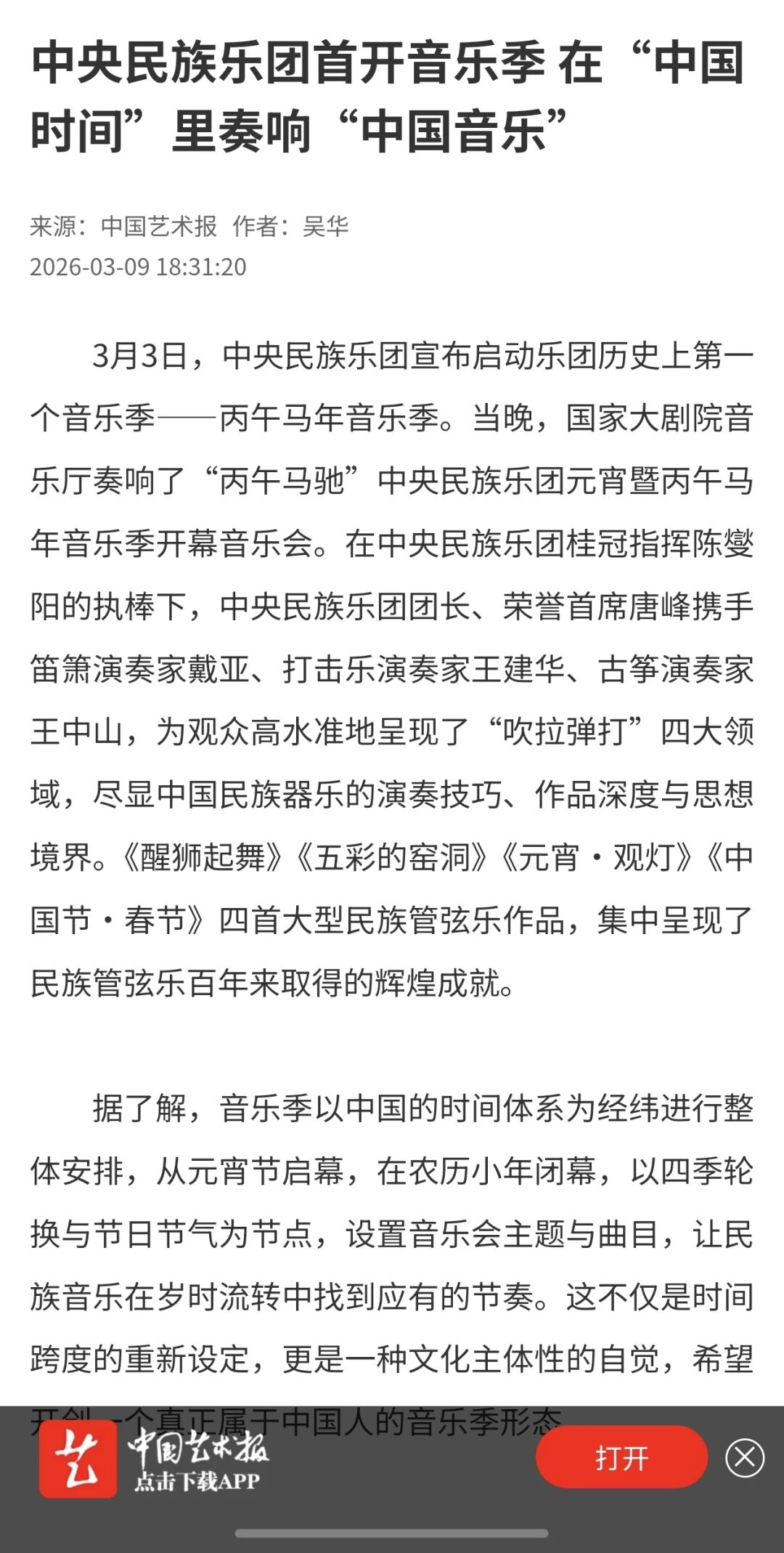 3月3日正值农历正月十五元宵佳节,中央民族乐团在北京举办新闻发布会,正式宣布启动乐团历史上第一个音乐季——丙午马年音乐季。当晚,“丙午马驰”中央民族乐团元宵暨丙午马年音乐季开幕音乐会在国家大剧院精彩上演。这是中央民族乐团成立66年首次启动音乐季。在66年的时光沉淀中,一大批具有民族特色的民族管弦乐作品经过整理挖掘、反复打磨,以全新的姿态走进大众视野,用民族的音乐语言讲述中国的时代故事。此次活动获得人民日报、光明日报、中央广播电视总台、新华社、中新社、中国文化报、音乐周报、中国日报、中国青年报、环球时报、中国艺术报、北京卫视、北京日报、北京青年报等诸多媒体的集中关注报道。