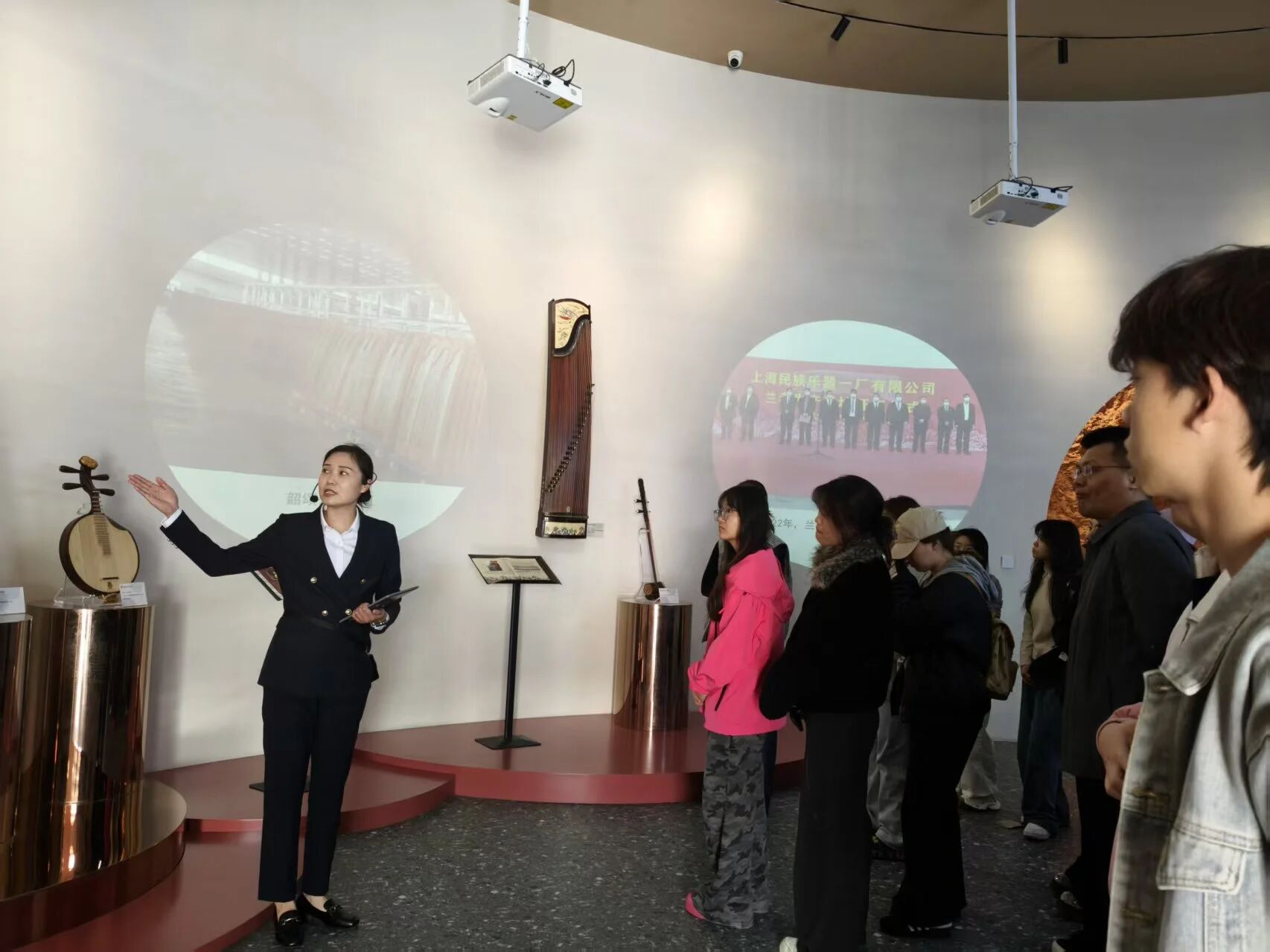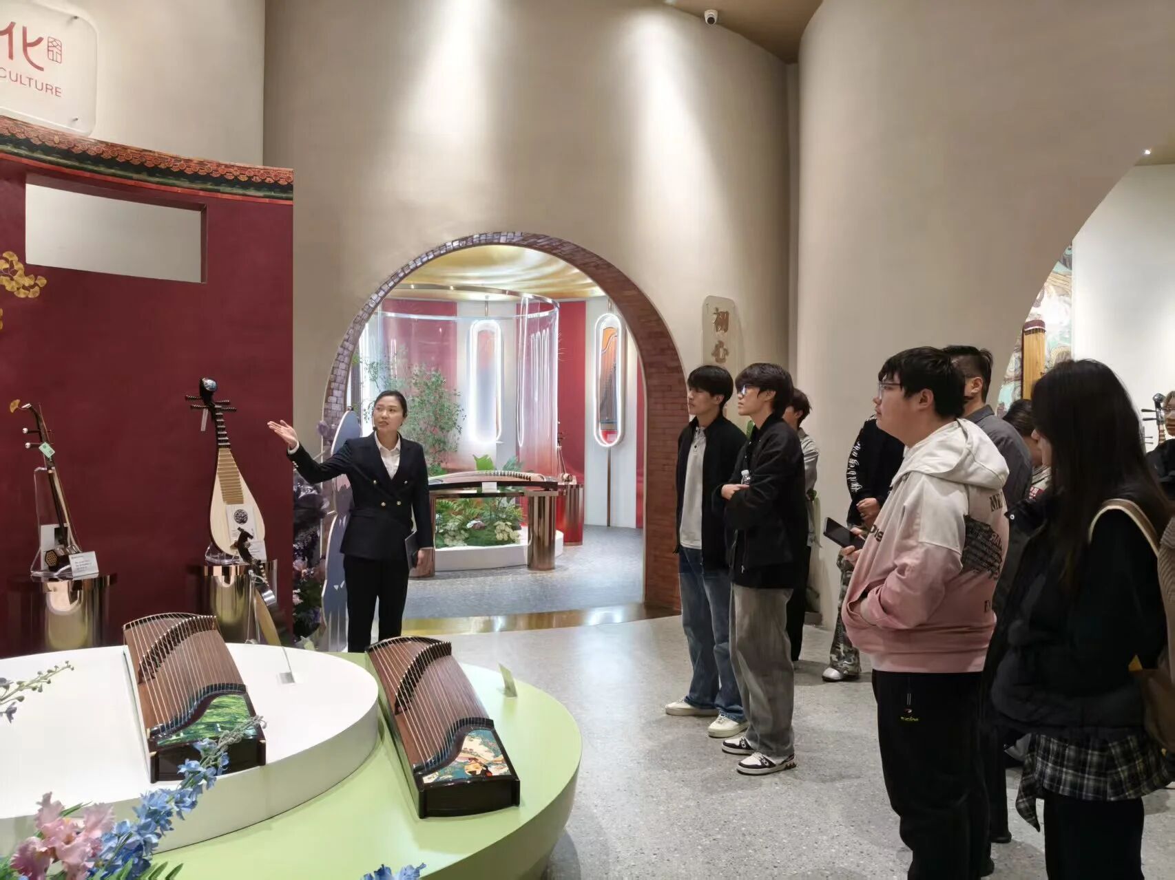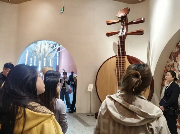 带着车间实操的收获与对乐器构造的认知,同学们走进国乐艺术馆。在讲解老师的带领下,目光从精密工序与零部件,转向一件件精美的乐器珍品。从古朴厚重的巨型阮咸,到精巧别致的微型乐器;从多方联名的匠心之作,到古今中外的文化交融。每一件乐器都承载着深厚的文化底蕴。
