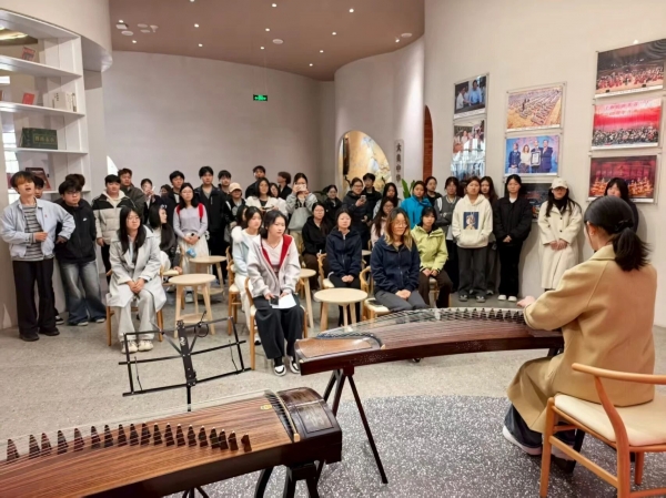 馆内,古筝老师现场教学,带领大家弹奏简单的国乐曲目,指尖轻拨琴弦,悠扬乐声回荡其间,让同学们在亲身演奏中感受国乐魅力。