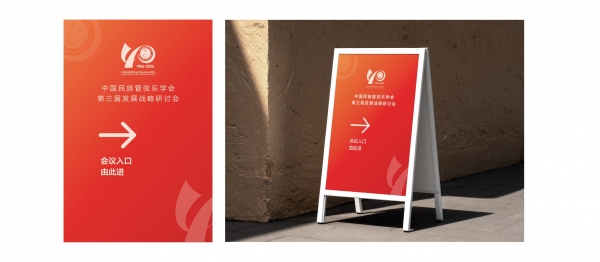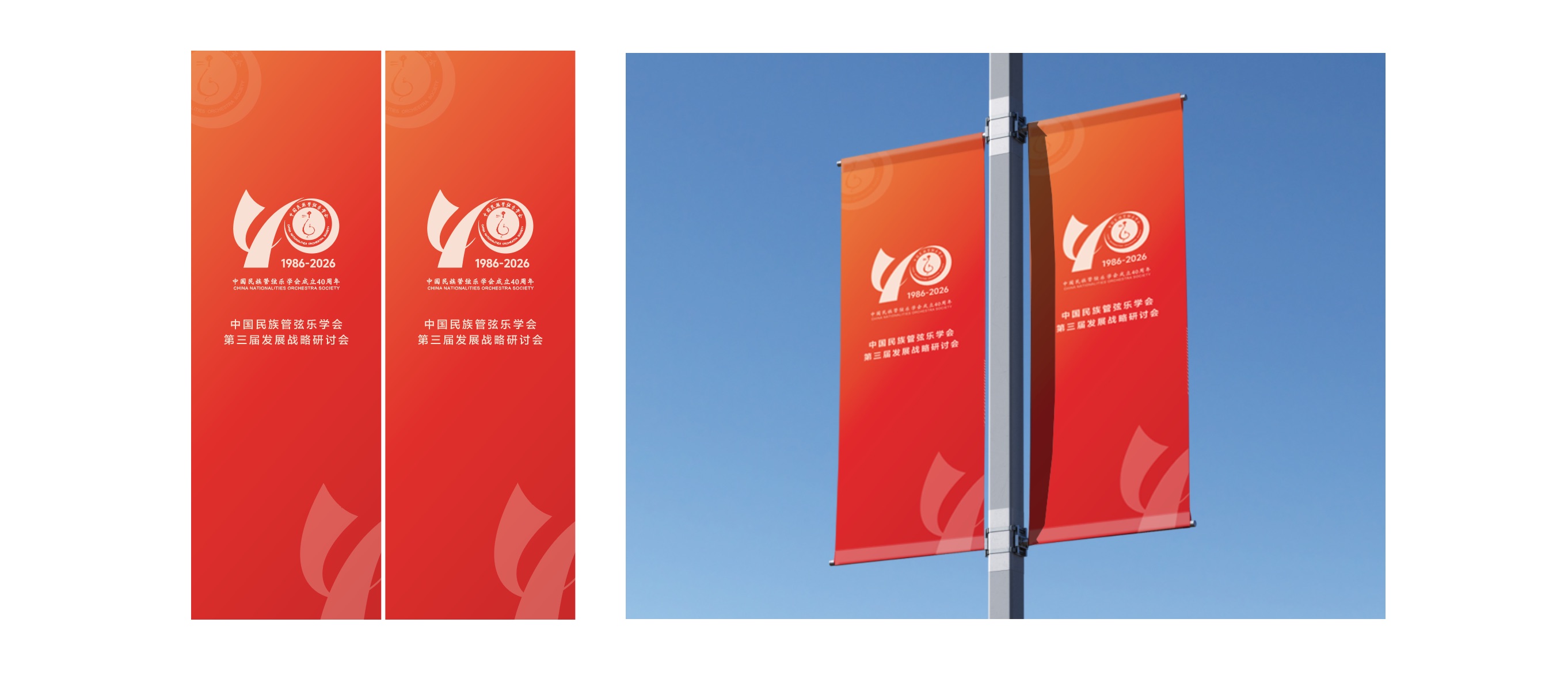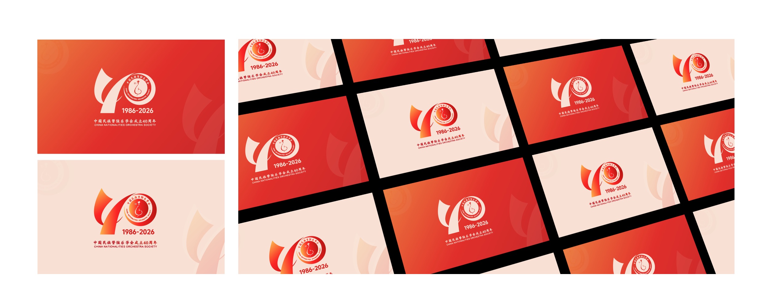 数字“0”被巧妙处理为圆形,并嵌入中国民族管弦乐学会的官方会徽。这一设计不仅点明了主体身份,更通过圆形的闭合感与庄重感,平衡了“4”的飘逸,寓意着学会40年发展的圆满与团结。