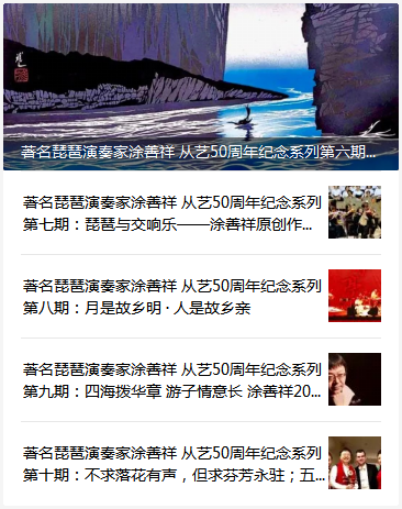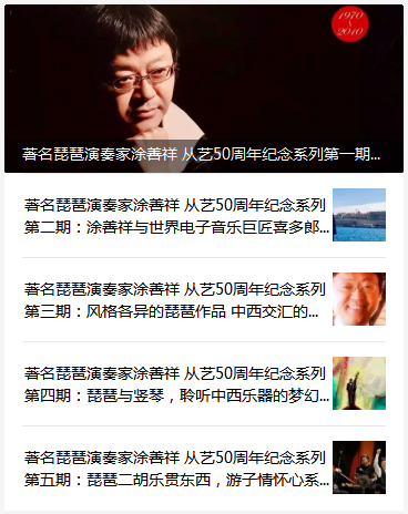 2020年,华音网在著名琵琶演奏家涂善祥老师从艺50周年之际,连续发布了十篇「著名琵琶演奏家涂善祥 从艺50周年纪念」系列推文。在十篇推送中,涂善祥老师选取了他演艺生涯中风格形式各异的精彩作品,带领各位读者朋友们,在这声声琵琶中进入了这位旅日音乐家的艺术世界。