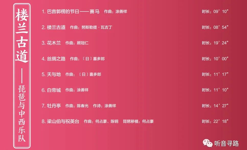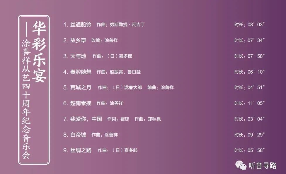 专辑中收录了大量涂善祥老师在世界范围内巡演以来的创作作品以及担任独奏、重奏或与世界各地多个交响乐团的合作演奏作品。