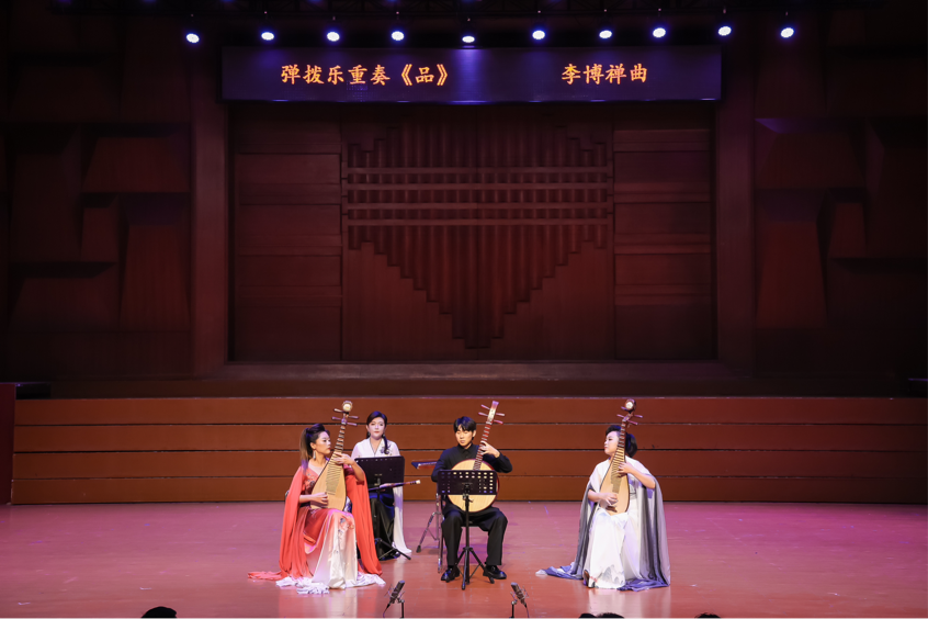 弹拨乐重奏《品》是由张强教授委约,由青年作曲家李博禅创作于2015年的一首作品。本次演出由杨婧副教授、武汉音乐学院讲师黎芸、武汉音乐学院讲师张莹莹与我系大三学生乔纯楼共同演绎完成,高超的技艺与悠扬的旋律带给听众无限的想象空间。