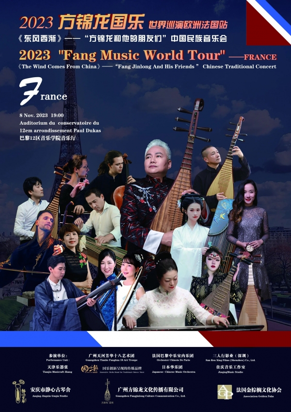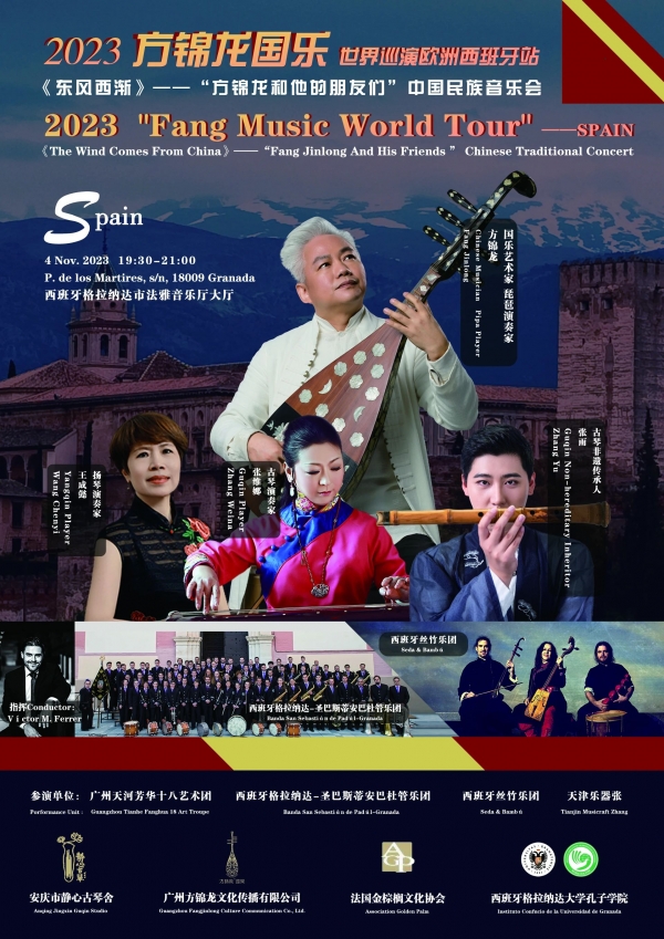 11月1日,国乐艺术家、乐器收藏家、当代五弦琵琶代表人物方锦龙将携十余人的团队启程前往欧洲,开启为期15天的2023“方锦龙国乐世界巡演”欧洲西班牙、法国站系列活动。其中,11月4日在西班牙格拉纳达与中外演奏家在法雅音乐厅,为中国和西班牙建交50周年系列纪念活动举办的《东风西渐》——“方锦龙和他的朋友们”中国民族音乐会、11月10日受法国巴黎高等艺术学院邀请在欧洲时报文化中心举办的题为《国乐无双》的讲演、11月13日于巴黎举办的“第二届中法文明对话大会”上讲演中法音乐的渊源,将是本次系列活动的重头戏;期间,专门面向年轻一代的各类活动,还包括指导西班牙格拉纳达大学孔子学院,和巴黎第十二区音乐学院学生管弦乐团演奏中国作品并在该校举办专场音乐会,在西班牙阿尔罕布拉宫和法国埃菲尔铁塔、篷皮杜艺术中心等地标性建筑前与来自中、日、法等国的中外演奏家进行街头快闪。