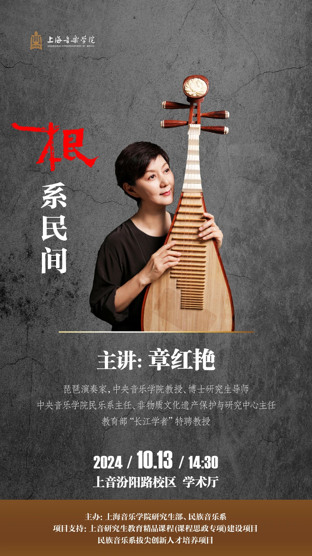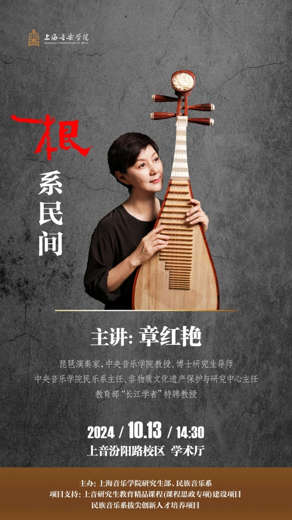 章红艳,琵琶演奏家、教育家,中央音乐学院博士生导师,民乐系主任,中央音乐学院非物质文化遗产保护与研究中心主任,教育部“长江学者”特聘教授。