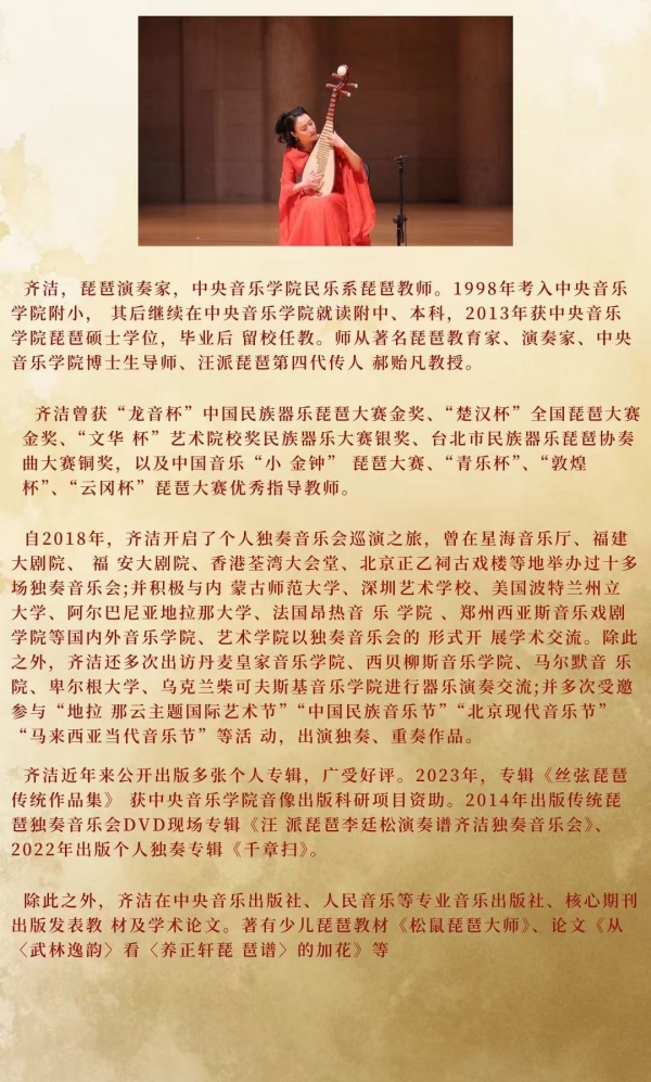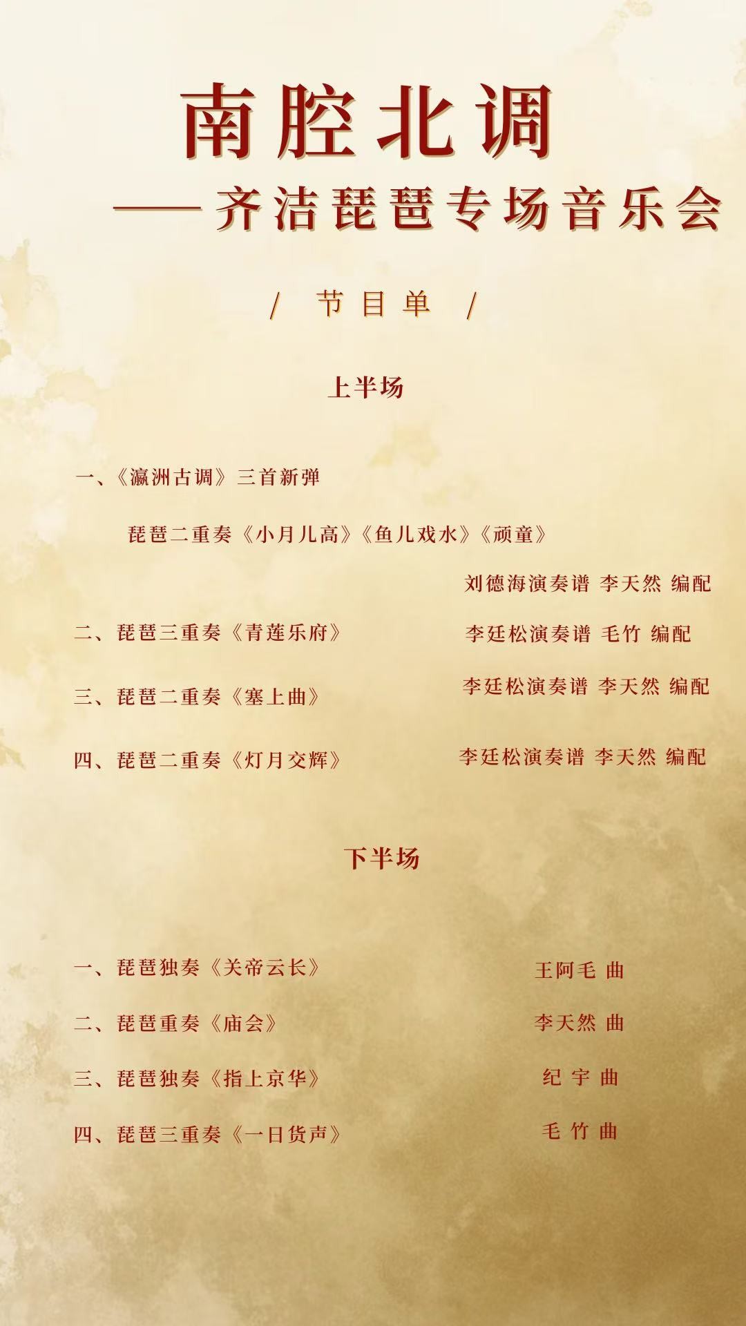本场音乐会的主旨是“新旧碰撞、南北对谈”。上半场是汪氏琵琶传统曲目的重新编配,2015年起,在汪派琵琶第四代传人郝贻凡教授的鼓励与促进下,齐洁和李天然对汪氏琵琶的传统曲目等共六首进行了编配,如二重奏版《灯月交辉》曾于2015年9月由郝贻凡和齐洁首演于中央音乐学院首届民族音乐节。与当下风行的创新式编配方式不同,此次上演的汪氏琵琶的传统曲目编配采用了“修旧如旧”式的写作思路,最大程度地保留原作的精神内核与音乐韵味,在更丰富的声部关系中重构原作的意趣,在音乐中完成一次与传统的对话。汪氏琵琶是南派琵琶的后起之秀,音调中富含江南音乐精细、雅致的韵味,因此上半场的曲目也将带领观众在音乐世界中领略清丽隽秀的江南风光。