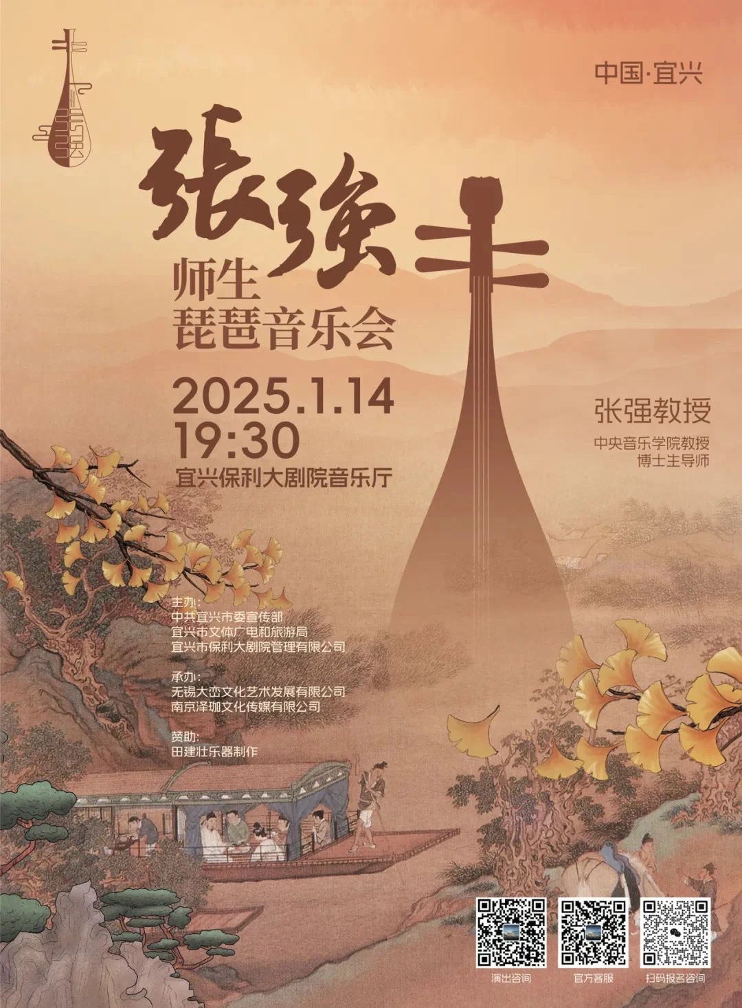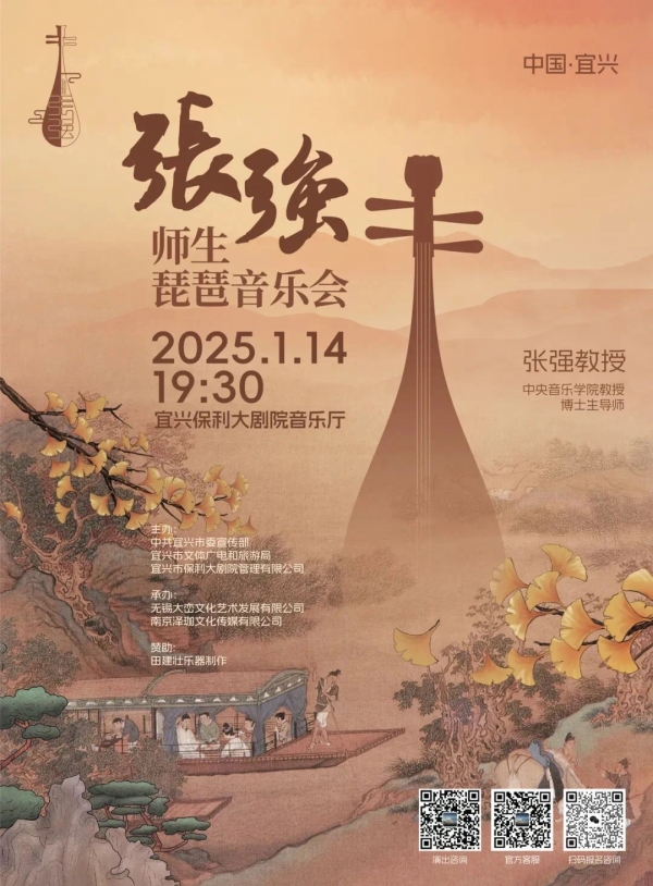 2025年1月14日晚,由中共宜兴市委宣传部、宜兴市文体广电和旅游局、宜兴市保利大剧院管理有限公司主办,无锡大峦文化艺术发展有限公司、南京泽珈文化传媒有限公司承办的张强师生琵琶音乐会在宜兴保利大剧院隆重上演。