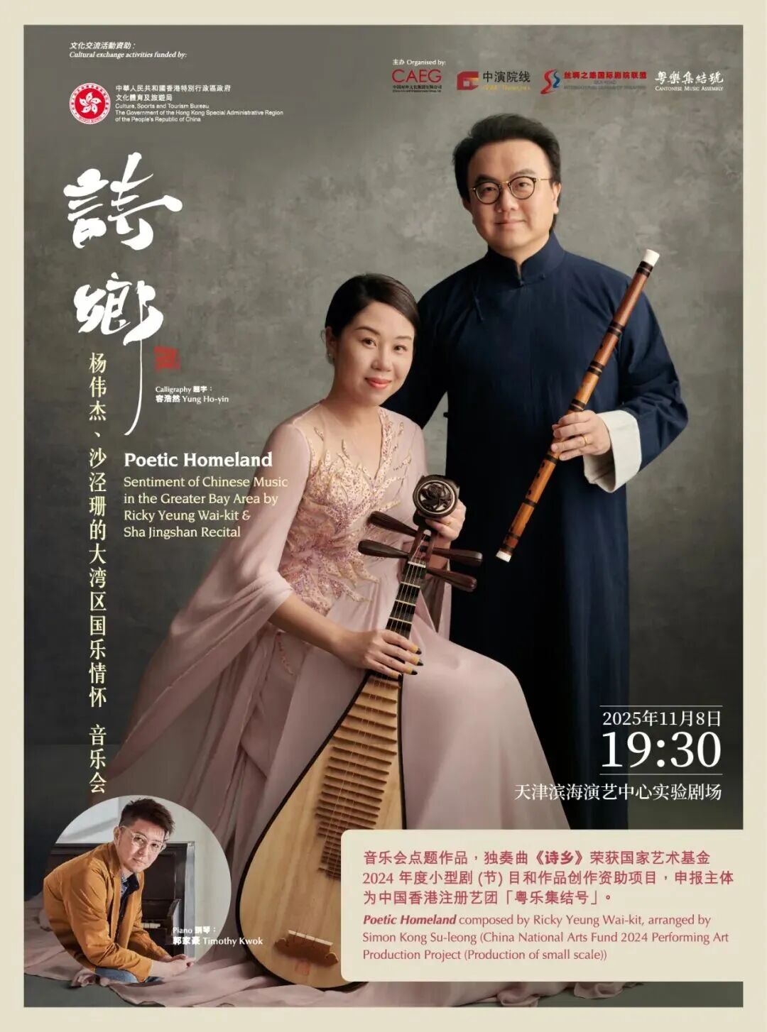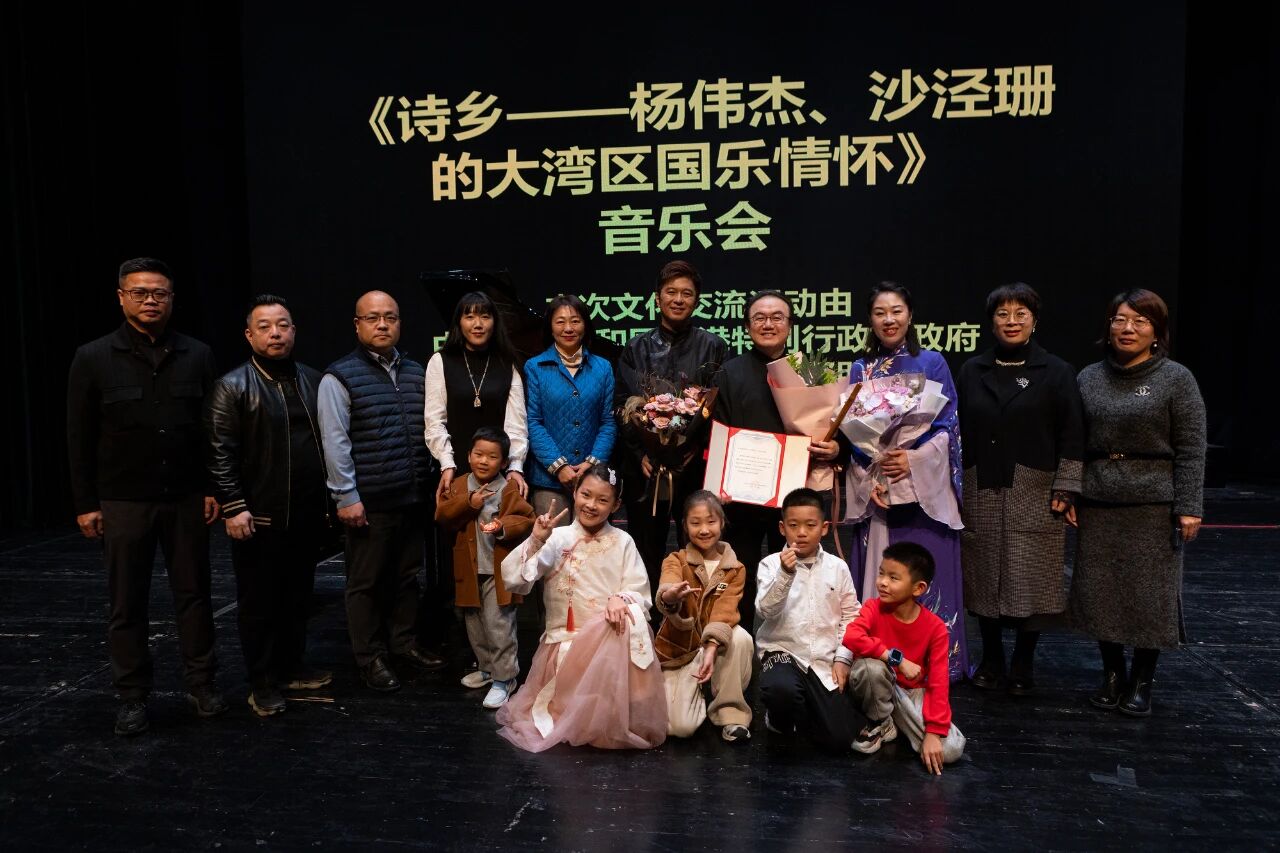 2025年11月8日晚,杨伟杰与沙泾珊伉俪领衔的《诗乡——大湾区国乐情怀》音乐会于天津滨海演艺中心圆满落幕,现场座无虚席。这场音乐会不仅奏响了南北交融的华美乐章,更谱写了一曲温暖人心的公益赞歌。