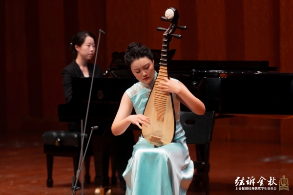 七首曲目中包含三首琵琶独奏作品:《昭君出塞》《秦俑》《月儿高》,三首琵琶和钢琴作品:《侬》《晚秋》《寻·耶婆瑟鸡》,以及一首琵琶重奏作品:《梦入江南》。值得一提的是,本场音乐会的演奏者年龄横跨附中三年级至研究生三年级,这一年龄跨度恰好展现了上音琵琶教学体系的完整脉络。少年学子的扎实功底与高年级学生的艺术深度在舞台上交相辉映,呈现出人才培养的阶段性成果。