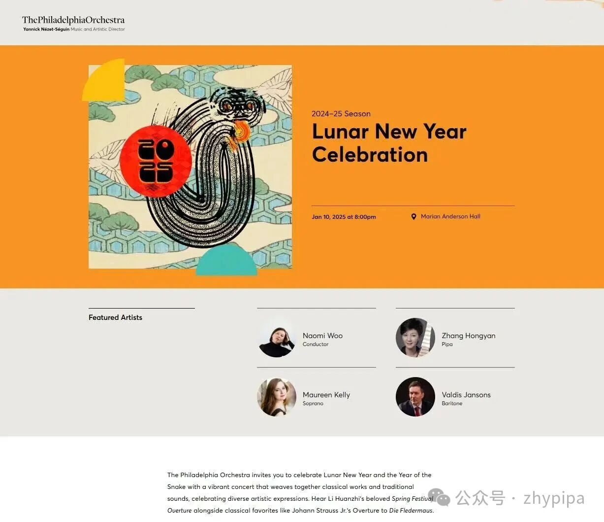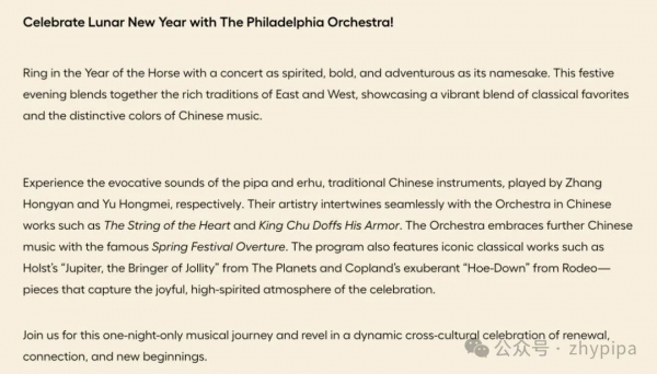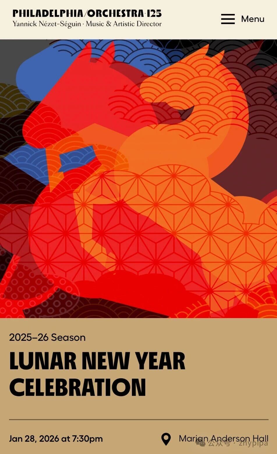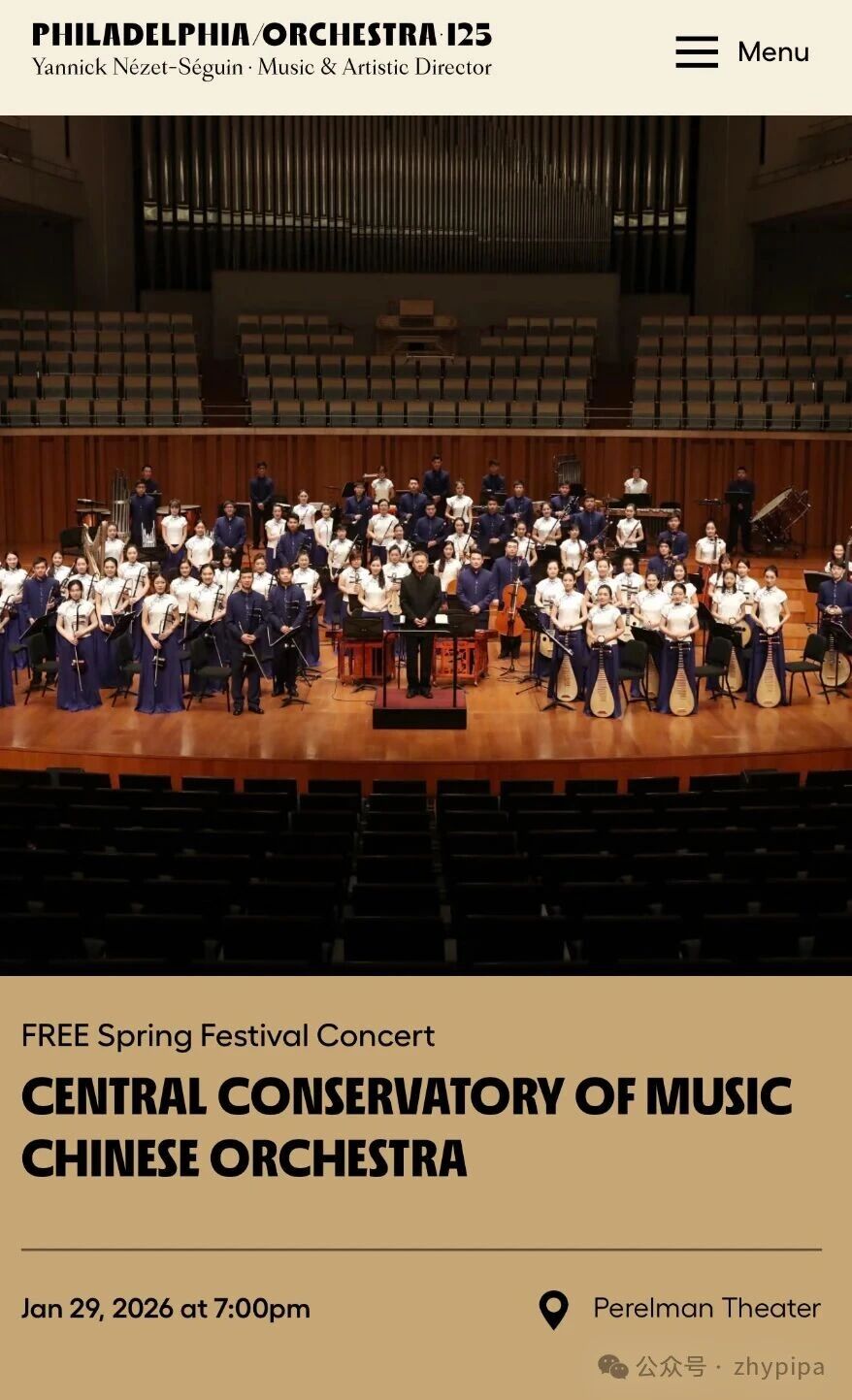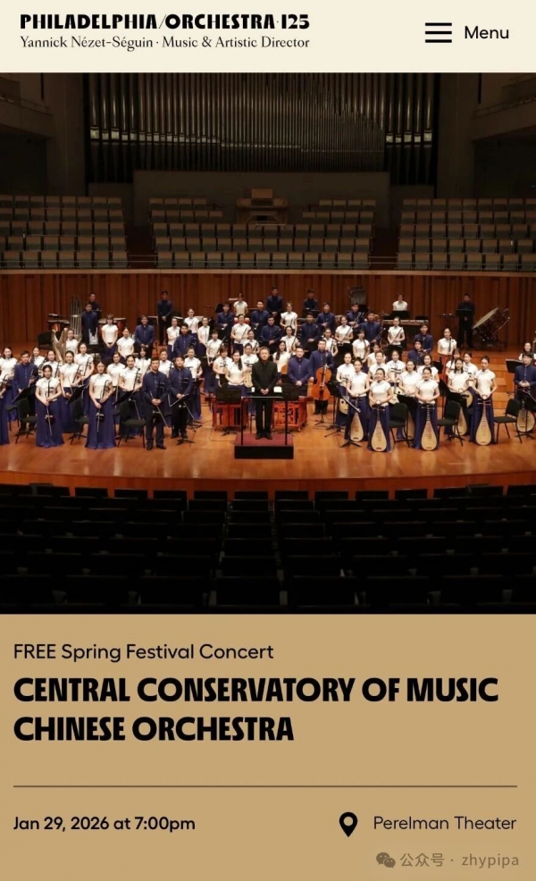 如今,回望这场跨越国界的音乐之约,依旧令人心潮澎湃。而这份音乐情谊并未落幕,2026 年 1 月 28 日,中央音乐学院院长于红梅教授、民乐系主任章红艳教授将再度携手费城交响乐团,带来 2026 农历马年新年音乐会;1 月 29 日,刘沙指挥将率领中央音乐学院民族管弦乐团登陆费城金梅尔表演艺术中心,献上一场中国民族音乐盛宴。