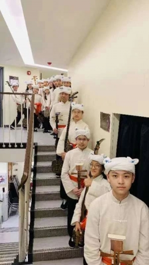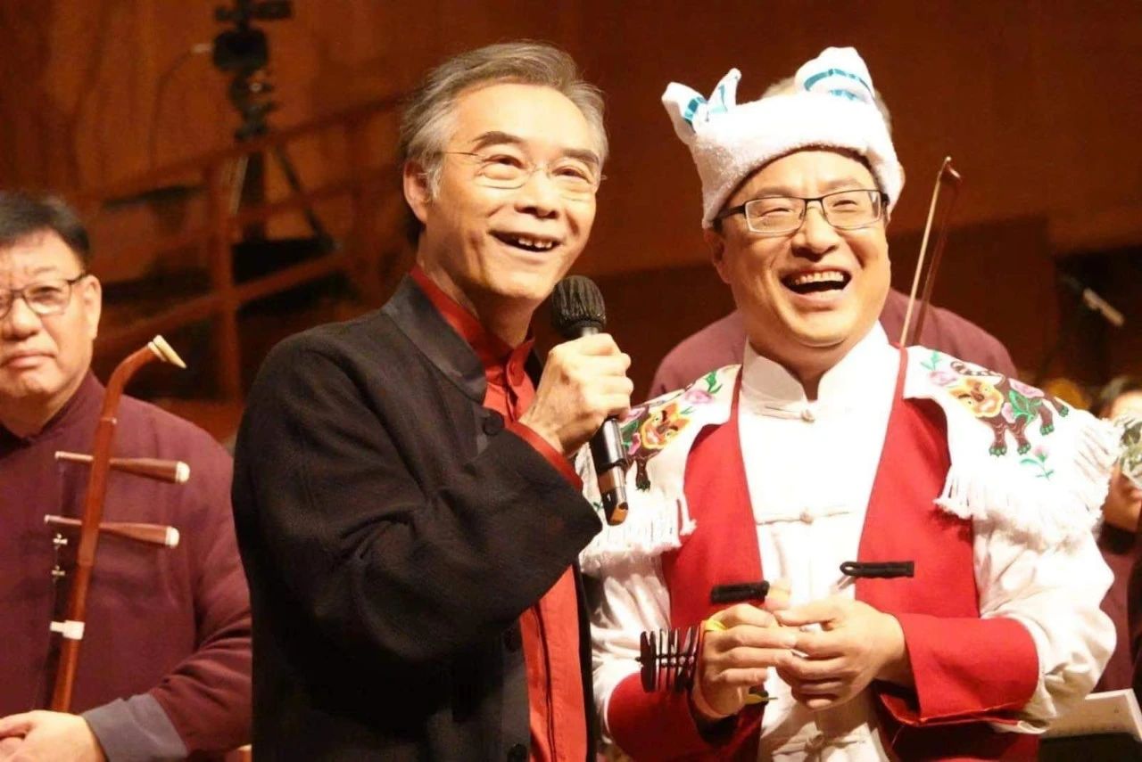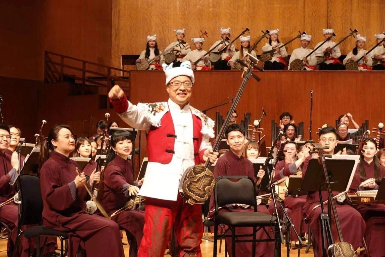 最辛苦要数劳苦功高的艺术总监、终身指挥阎惠昌教授。这两场音乐会,虽然我要弹五首协奏曲,但我认为最累的应该是阎总监。排练时他并非仅仅只是排练,对每一首乐曲,每一个乐句都有仔细的分析,并且举一反三,往往能很快启发团员们的思路,尤其是我,达到人、曲、音、器的和协统一,即有严厉的要求,也有温暖的包容。经过阎总监一个星期面对面的启发、引导、谆谆教诲,我感觉自己又有了明显的进步:第一首:吴华的《弦诗鼓韵》,如何把老北京皇城根下八旗子弟的风土人情表现出来,又如何处理战争紧张的场面;《山外》是一首新作品,引子如何弹出古人的潇洒逸情,正如作曲家所说,站在山外看世界,一山过后又看到新的世界,中间7/8、5/8的节奏如何圆润、华丽的从传统到现代;《黑土歌》虽然相对比较熟了,但让我再次体会到了肥沃的黑土以及台上音乐家们的呐喊给我的力量和感悟;《傩》是我第三次演奏了,但每一次感觉都不同,作品的张力特别大,引子的神秘、方相氏的威严、精灵的舞蹈、驱疫弃火及尾声,每次我都觉得自己就是方相氏,现实今日,这首作品更是具有时代感;最后收官《刮大风》,有陝北粉丝亲手绣的上衣、裤子、布鞋,有陝北说书艺人亲手做的响板、麻蚱蚱,特意绣出三道蓝的头巾,再加上15个学生醒目的陝北小汉子装束,场面立马充溢着浓郁的陝北风,我弹唱的《刮大风》更有情景,更有质感。我相信,如果这种排练时间再长一些,我肯定还有更长足的提升空间,真的是艺无止境。除了严格、繁重、一丝不苟的排练外,阎总监细腻到我每首曲子用那把琴、换琴时有没有人负责调琴、服装来不来得及换等等,事无巨细都一一关心,总监,您辛苦了。