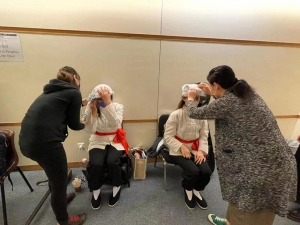 由于这次演出多了15个学生从头到脚的服饰,衣服、鞋合不合适都做了大量工作,尤其是头上包的头巾,这是陝北的标志,而且包头巾有着严格的规矩,否则会不像,不地道。服装部玲姐、阿囡、汉儿等同事再三观看陝北艺人发来的包头巾的视频,认真学习,男仔头髮少,女仔头髮多,她们想尽办法,尽量把头巾包的规矩、地道,正是有了她们的认真,我们才能看到舞台上一溜清一色的陝北小汉子们弹着三弦《刮大风》。