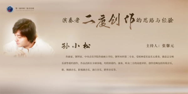 2023年7月26日19:00,第三届“中国三弦音乐周”学术活动——《演奏者“二度创作”的思路与经验》教学公开课在内蒙古呼和浩特市乌力格尔艺术宫举行,由作曲家孙小松老师主讲,哈尔滨音乐学院张馨元老师担任主持。本场教学公开课以“演奏者把音乐作品从书面符号转变为具体音乐形象的过程”这一“二度创作”行为作为中心展开,进行了多维度讲解。