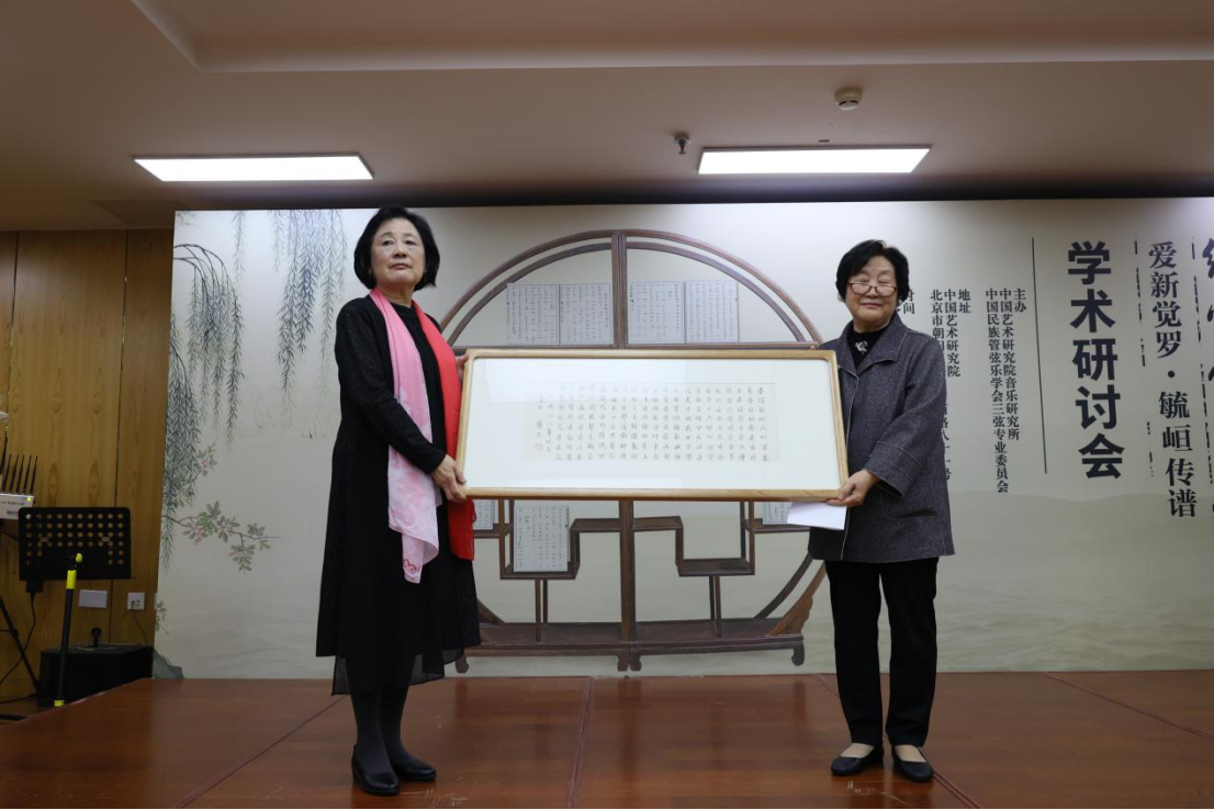 研讨会分成开幕式,主旨发言,学术讨论,演奏展示,文本发言,闭幕式六个部分。研讨会的开幕式由音乐研究所冯卓慧副所长主持,中国艺术研究院副院长喻静女士;中国民族管弦乐学会副会长兼秘书长赵东升先生;音乐研究所所长李宏峰研究员;中国民族管弦乐学会三弦专业委员会常务副会长领春女士先后发言致辞,爱新觉罗·毓峘先生的夫人朱维华女士也为大会致辞,并将溥杰先生为爱新觉罗·毓峘传谱而亲笔书写的撰文赠送给毓峘先生的嫡传弟子谈龙建教授,以此作为弦索音乐传承的证物,也希望在座的专家学者为此做个见证。
