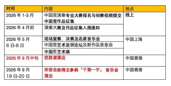 (4) 各组优胜者将获得由天津市精艺(王家笙)乐器有限公司提供的专业级37簧传统改良圆笙或36簧加键方笙等各类奖品。获奖者将有机会受邀于9月19日与20日赴香港进行展演;其中A-1组与A-2组优胜者还将与香港中乐团合作演出(差旅费用自理)