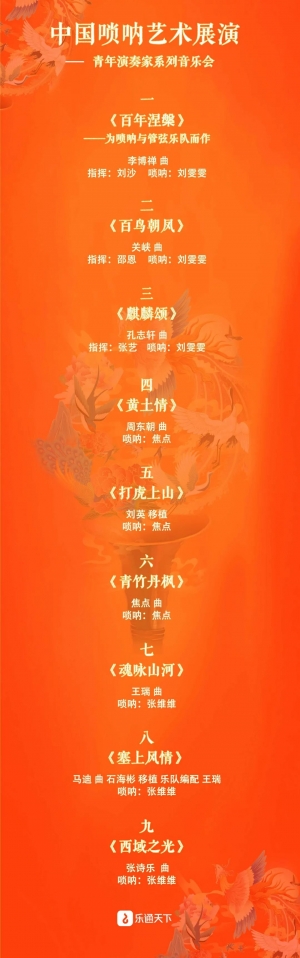 首演作品:《塞上风情》(唢呐版)马迪、《西域之光》(唢呐版)张诗乐、《魂咏山河》王瑞、唢呐与交响乐队协奏曲《光锥内外》史付红、《山野情》(中国首演)李恒。