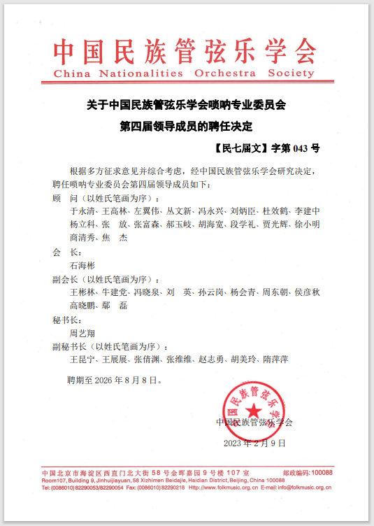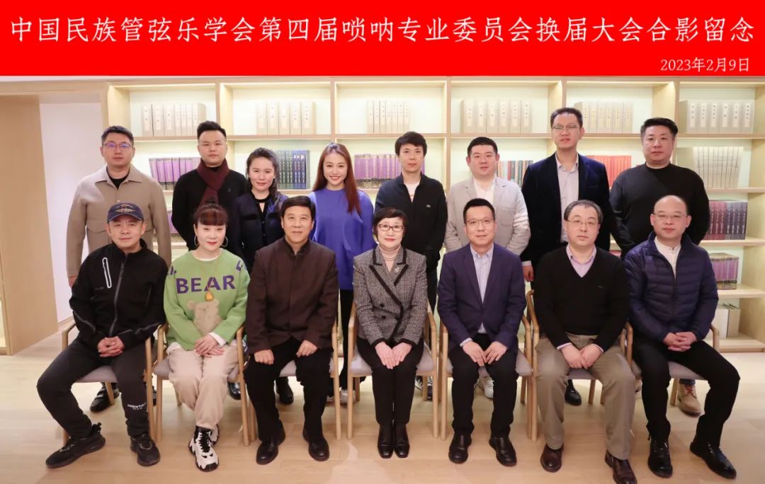2023年2月9日,中国民族管弦乐学会唢呐专业委员会换届大会在京召开。中国民族管弦乐学会会长吴玉霞、副会长兼秘书长赵东升、副秘书长宋阳以及唢呐专业委员会新一届领导班子成员代表参加会议。