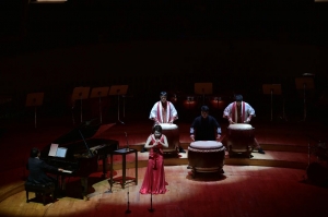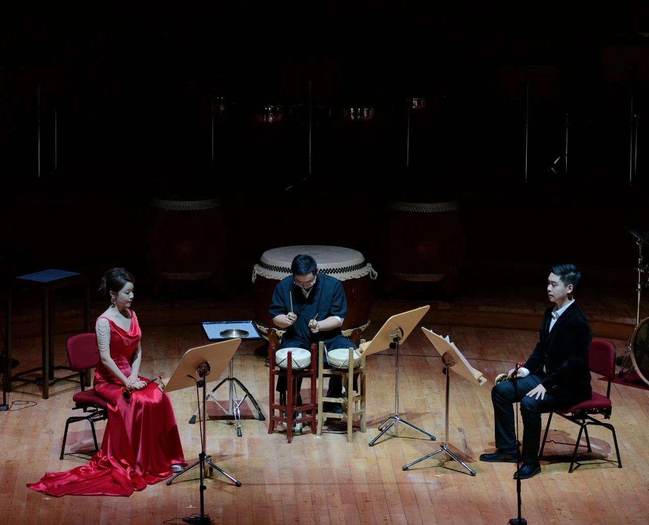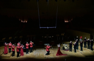 《火之舞》作为音乐会的开场曲目,用鼓乐的编排作为引子,将音乐之火瞬间点燃。鼓声将息,唢呐苍劲浑厚的乐音在后台响起,奏出了人类对火的狂热崇拜。在充满异域风情的音阶反复中,演奏家刘雯雯身着红色礼服,犹如火之女神缓步降临。