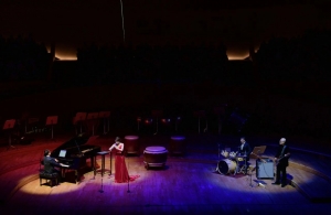 伴随着轻柔舒缓的钢琴,音乐会的灯光从火红切换成了蓝紫色调。一曲《夜来梦江南》通过钢琴、唢呐、架子鼓和贝斯,向观众讲述了一个美丽的爱情故事,展现了唢呐与流行音乐元素跨界的一面。