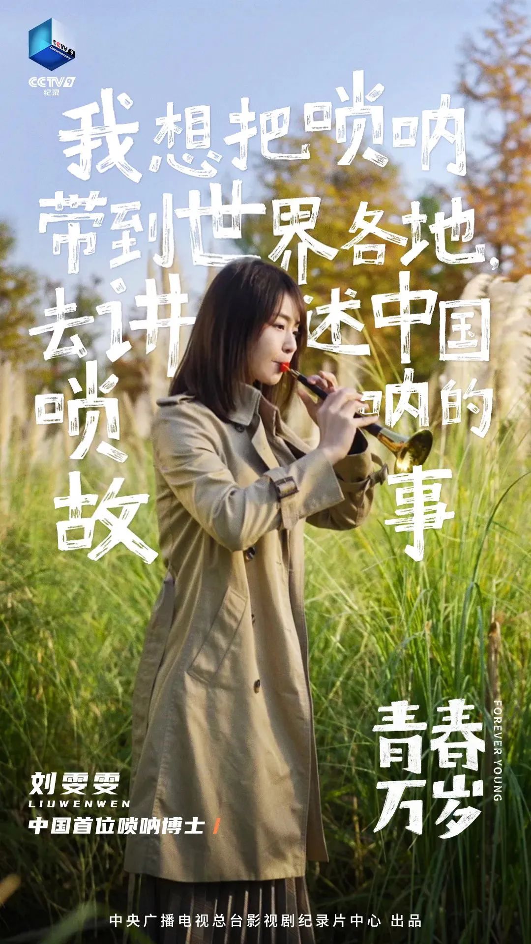 由唢呐演奏家刘雯雯拍摄的纪录片《青春万岁》于今晚19:50 CCTV-9频道播出!