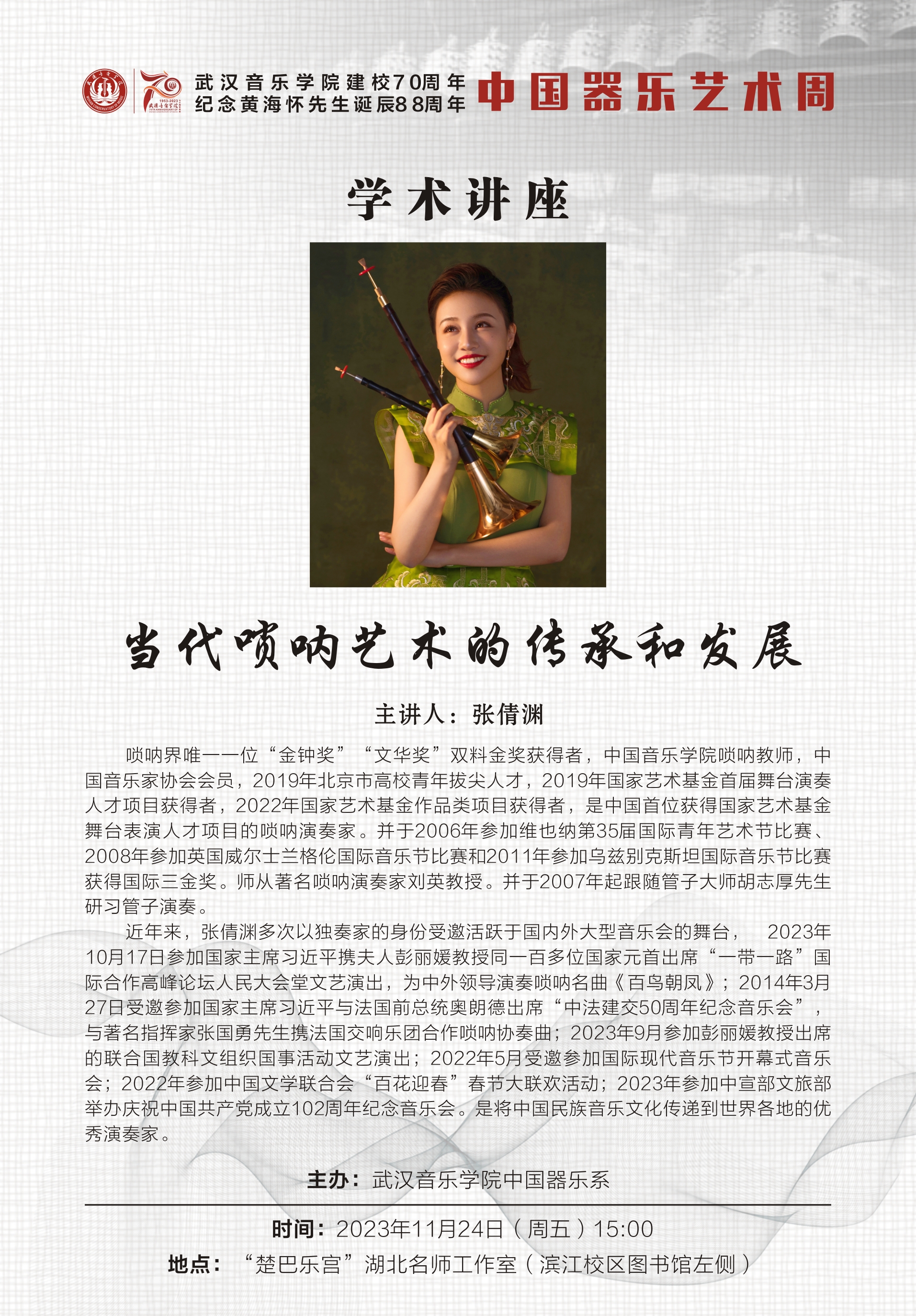 张倩渊,唢呐界唯一一位“金钟奖”“文华奖”双料金奖获得者,中国音乐学院唢呐教师,中国音乐家协会会员,2019年北京市高校青年拔尖人才,2019年国家艺术基金首届舞台演奏人才项目获得者,2022年国家艺术基金作品类项目获得者,是中国首位获得国家艺术基金舞台表演人才项目的唢呐演奏家。并于2006年参加维也纳第35届国际青年艺术节比赛、2008年参加英国威尔士兰格伦国际音乐节比赛和2011年参加乌兹别克斯坦国际音乐节比赛获得国际三金奖。师从著名唢呐演奏家刘英教授。并于2007年起跟随管子大师胡志厚先生研习管子演奏。