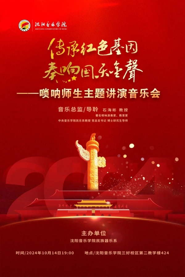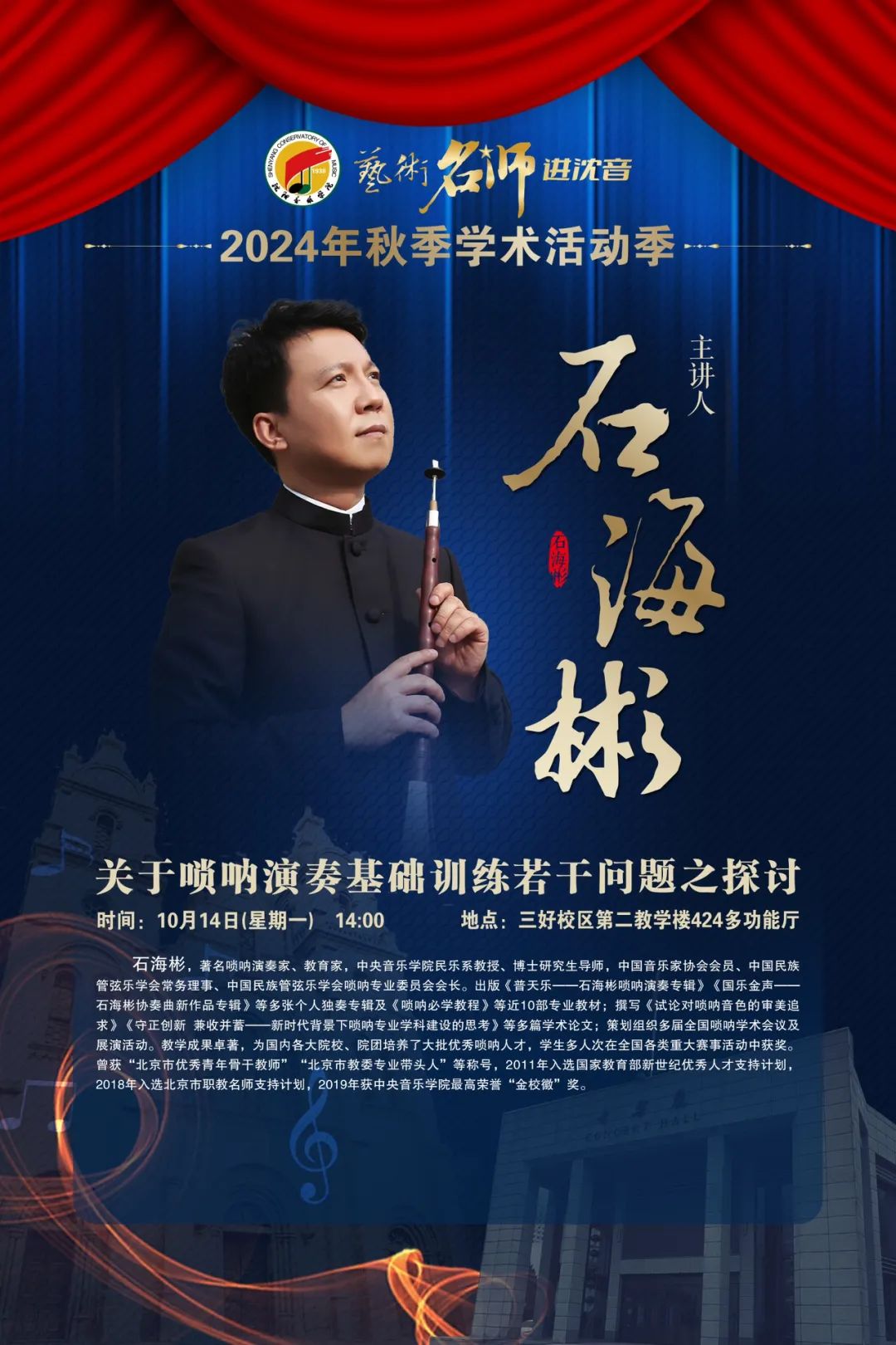 学院举行“ 进一步全面深化改革 共谋创新发展之路——专业艺术教育高质量发展”系列活动,民族器乐系特邀著名唢呐演奏家、教育家,中央音乐学院民乐系教授、党总支书记、博士研究生导师石海彬教授,将为学院广大师生带来精彩纷呈的学术讲座与音乐盛宴。