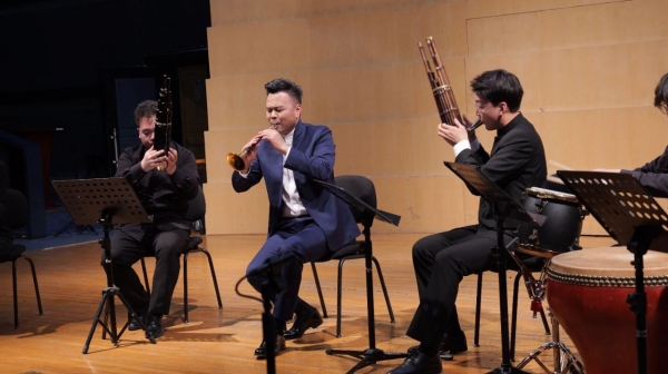 这一理念不仅适用于演奏传统乐曲,对于演绎当代具有创新性的唢呐曲目亦如是。下半场演奏的《霸王别姬》(朱毅曲)和《唤凤》(秦文琛曲),体现出唢呐在协奏曲体裁的艺术表现力,并在当晚以唢呐与钢琴的形式呈现。下半场中,王展展展示了其对乐器的绝佳掌控力。其中《霸王别姬》以京剧曲调为素材,利用当代的创作技法,展现出唢呐豪放与委婉兼备的特点。在作曲家朱毅眼中,此曲打破了唢呐只演奏民间乐曲的刻板印象,拓展了唢呐表现结构复杂、情感细腻乐曲的可能性。王展展的诠释可谓“精典”——既精湛又典雅,能够在完成高难度技术的同时,演奏出传统的文化之韵。《唤凤》是受油画《火中的凤凰》启迪而作,将唢呐的丰富音色转变为具有画面感的音乐语言。这首作品通过别具巧思的音色布局,描绘出一幅鸿蒙初开、凤凰涅槃的音乐画卷。王展展在演奏凤凰涅槃时的戏剧性张力让现场观众皆震撼其中。“《唤凤》这首作品,不仅是对生命形态的探讨,更是上升到了对于人生哲学的深刻见解。”王展展如是说。
